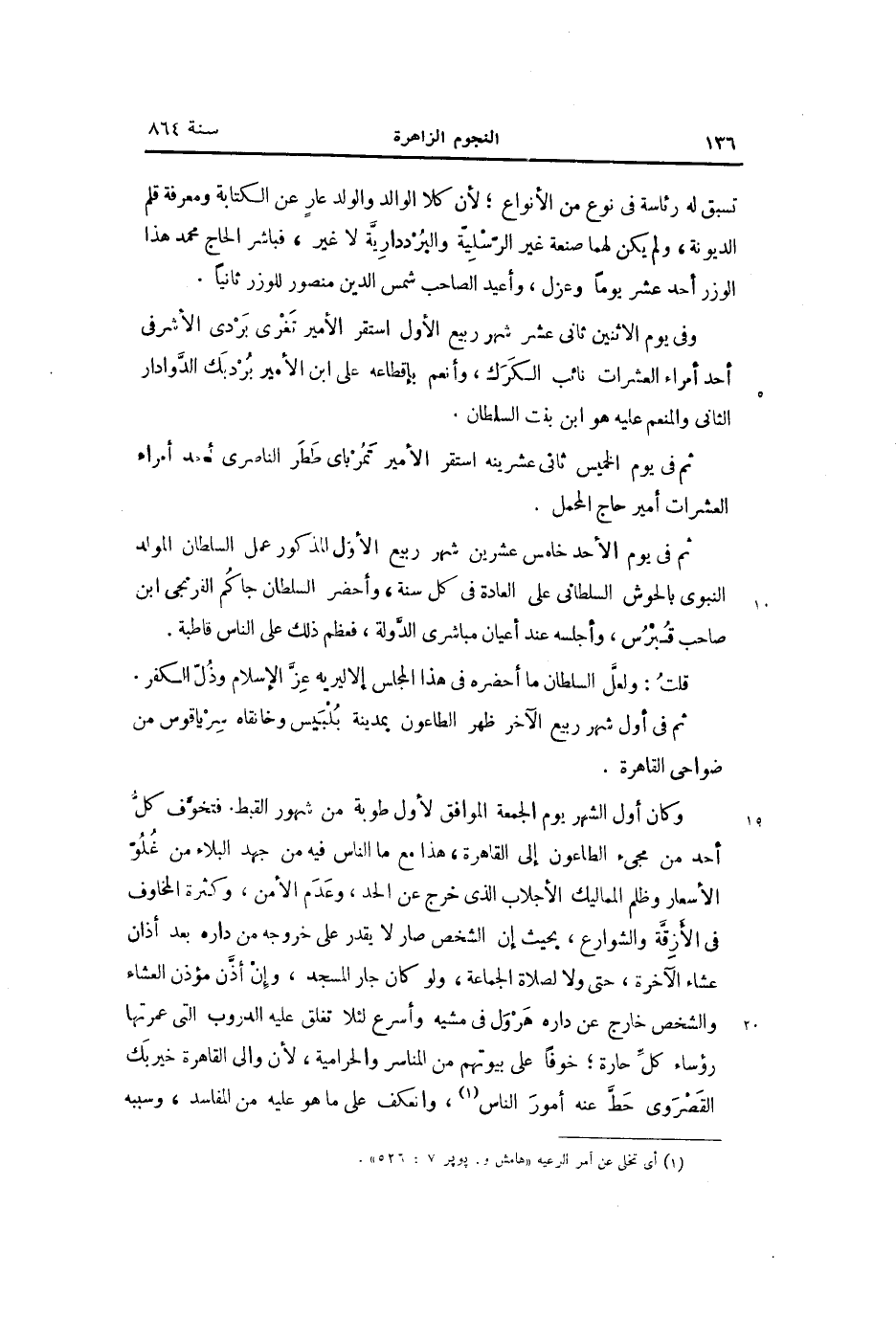 وكان أول الشهر يوم الجمعة الموافق لأول طوبة من شهور القبط. فتخوّف كلّ أحد من مجىء الطاعون إلى القاهرة، هذا مع ما الناس فيه من جهد البلاء من غلوّ الأسعار وظلم المماليك الأجلاب الذي خرج عن الحد، وعدم الأمن، وكثرة المخاوف فى الأزقّة والشوارع، بحيث إن الشخص صار لا يقدر على خروجه من داره بعد أذان عشاء الآخرة، حتى ولا لصلاة الجماعة، ولو كان جار المسجد، وإن أذّن مؤذن العشاء والشخص خارج عن داره هرول في مشيه وأسرع لئلا تغلق عليه الدروب التي عمرتها رؤساء كلّ حارة؛ خوفا على بيوتهم من المناسر والحرامية، لأن والى القاهرة خيربك القصروى حطّ عنه أمور الناس «1» ، وانعكف على ما هو عليه من المفاسد، وسببه