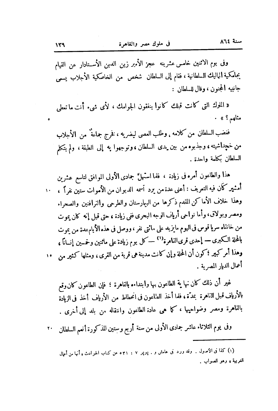 غير أن ذلك كان نهاية الطاعون بها وابتداءه بالقاهرة؛ فإن الطاعون كان وقع بالأرياف قبل القاهرة بمدّة، فلما أخذ الطاعون في انحطاط من الأرياف أخذ في الزيادة بالقاهرة ومصر وضواحيها، كما هى عادة الطاعون وانتقاله من بلد إلى أخرى.