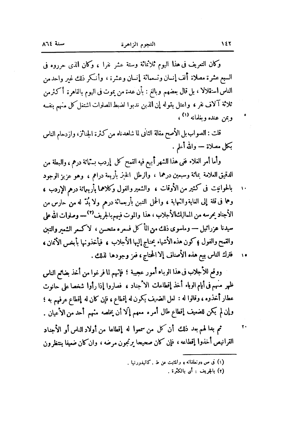 وأما أمر الغلاء ففى هذا الشهر أبيع فيه القمح كل إردب بستمائة درهم، والبطة من الدقيق العلامة بمائة وسبعين درهما، والرطل الخبز بأربعة دراهم، وهو عزيز الوجود بالحوانيت في كثير من الأوقات، والشعير والفول وكلاهما بأربعمائة درهم الإردب، وهما في قلة إلى الغاية والنهاية، والحمل التبن بأربعمائة درهم ولا بدّ له من حارس من الأجناد يحرسه من المماليك الأجلاب، هذا والموت فيهم بالجريف «2» - وصلوات الله على سيدنا عزرائيل- وما سوى ذلك من المأكل فسعره متحسن، لا كسعر الشعير والتبن والقمح والفول؛ كون هذه الأشياء يحتاج إليها الأجلاب، فيأخذونها بأبخس الأثمان، فترك الناس بيع هذه الأصناف إلا المحتاج، فعز وجودها لذلك.