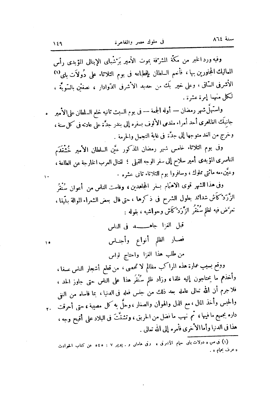 وفي يوم الثلاثاء خامس شهر رمضان المذكور عيّن السلطان الأمير خشقدم الناصرى المؤيدى أمير سلاح إلى سفر الوجه القبلى؛ لقتال العرب الخارجة عن الطاعة، وعيّن معه مائتى مملوك، وسافروا يوم الثلاثاء ثانى عشره.
