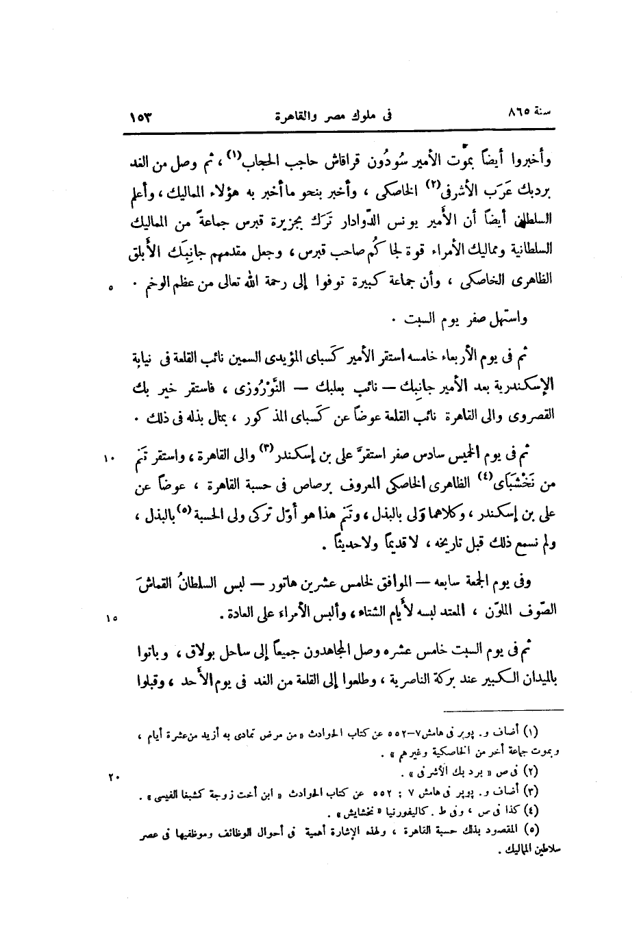 ثم في يوم الخميس سادس صفر استقرّ على بن إسكندر «3» والى القاهرة، واستقر تنم من نخشباى «4» الظاهرى الخاصكى المعروف برصاص في حسبة القاهرة، عوضا عن على بن إسكندر، وكلاهما ولى بالبذل، وتنم هذا هو أوّل تركى ولى الحسبة «5» بالبذل، ولم نسمع ذلك قبل تاريخه، لا قديما ولا حديثا.