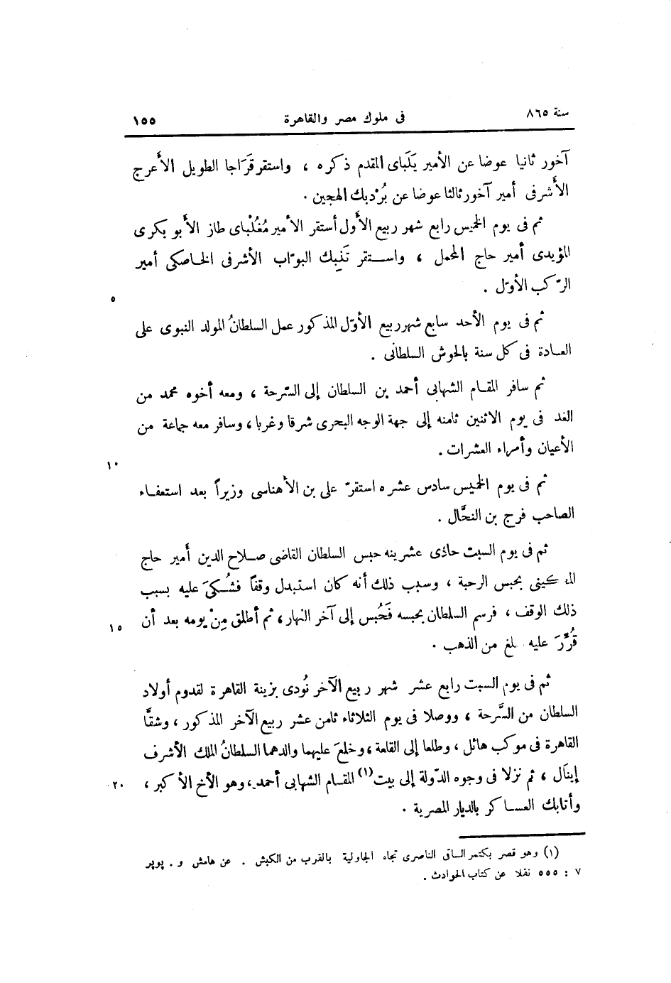 ثم في يوم السبت رابع عشر شهر ربيع الآخر نودى بزينة القاهرة لقدوم أولاد السلطان من السّرحة، ووصلا في يوم الثلاثاء ثامن عشر ربيع الآخر المذكور، وشقّا القاهرة في موكب هائل، وطلعا إلى القلعة، وخلع عليهما والدهما السلطان الملك الأشرف إينال، ثم نزلا في وجوه الدّولة إلى بيت «1» المقام الشهابى أحمد، وهو الأخ الأكبر، وأتابك العساكر بالديار المصرية.