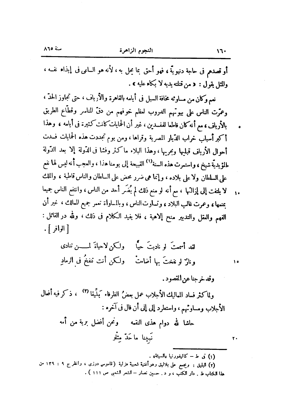 نعم وكان من مساوئه مخافة السبل في أيامه بالقاهرة والأرياف، حتى تجاوز الحدّ، وعمّرت الناس على بيوتهم الدروب لعظم خوفهم من دقّ المناسر وقطّاع الطريق بالأرياف، مع أنه كان قاطعا للمفسدين، غير أن الحمايات كانت كثيرة في أيامه، وهذا أكبر أسباب خراب الدّيار المصرية وقراها، ومن يوم تجددت هذه الحمايات فسدت أحوال الأرياف قبليها وبحريها، وهذا البلاء ما كثر وفشا في الدّولة إلا بعد الدّولة المؤيّديّة شيخ، واستمرت هذه السنة «1» القبيحة إلى يومنا هذا، والعجب أنه ليس لها نفع على السلطان ولا على بلاده، وإنما هى ضرر محض على السلطان والناس قاطبة، والملك لا يلتفت إلى إزالتها، مع أنه لو منع ذلك لم يضر أحد من الناس، وانتفع الناس جميعا بمنعها، وعمرت غالب البلاد، وتساوت الناس، وبالمساواة تعمر جميع الممالك، غير أن الفهم والعقل والتدبير منح إلاهية، فلا يفيد الكلام في ذلك، ولله در القائل: