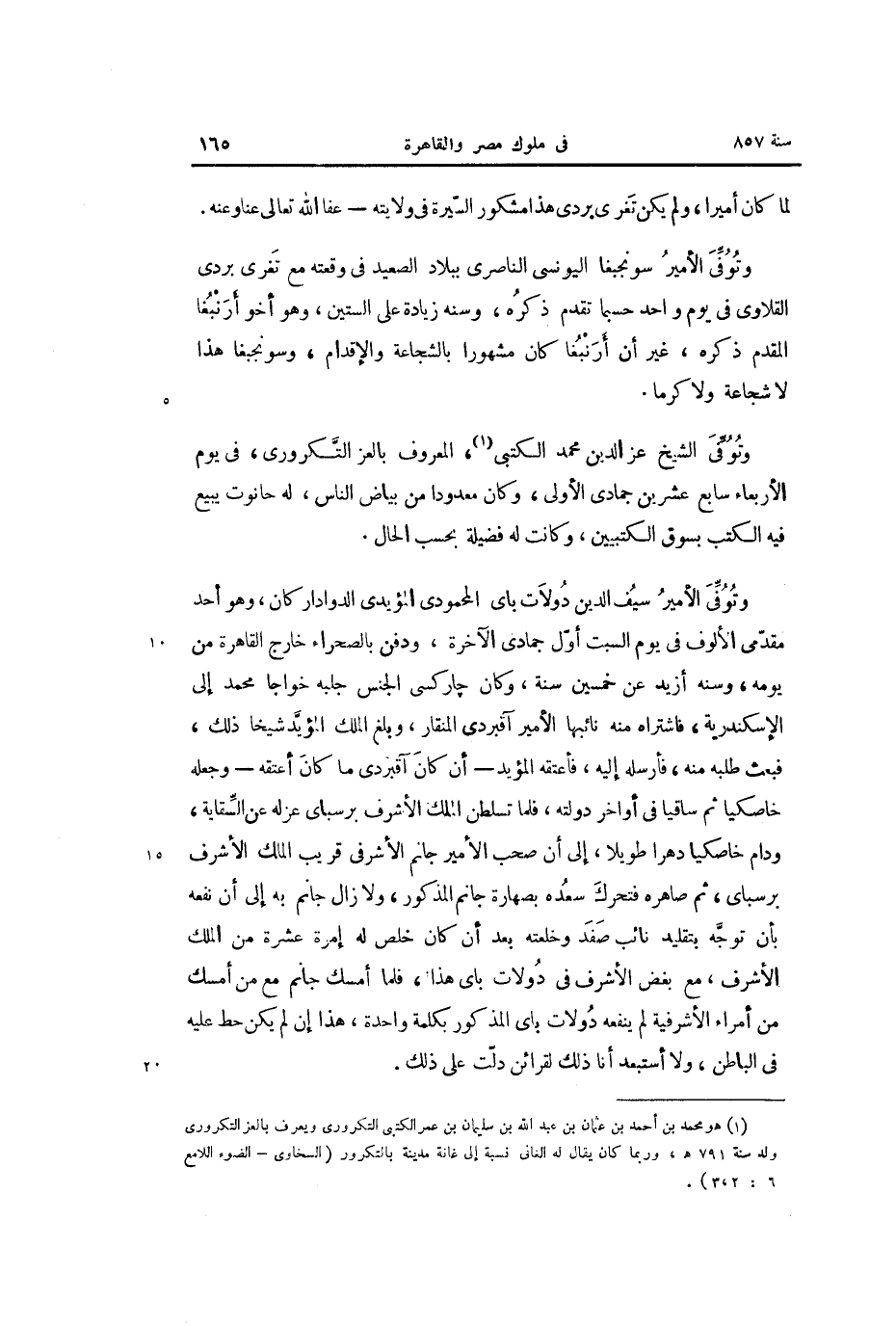 وتوفّى الشيخ عز الدين محمد الكتبى «1» ، المعروف بالعز التّكرورى، فى يوم الأربعاء سابع عشر بن جمادى الأولى، وكان معدودا من بياض الناس، له حانوت يبيع فيه الكتب بسوق الكتبيين، وكانت له فضيلة بحسب الحال.