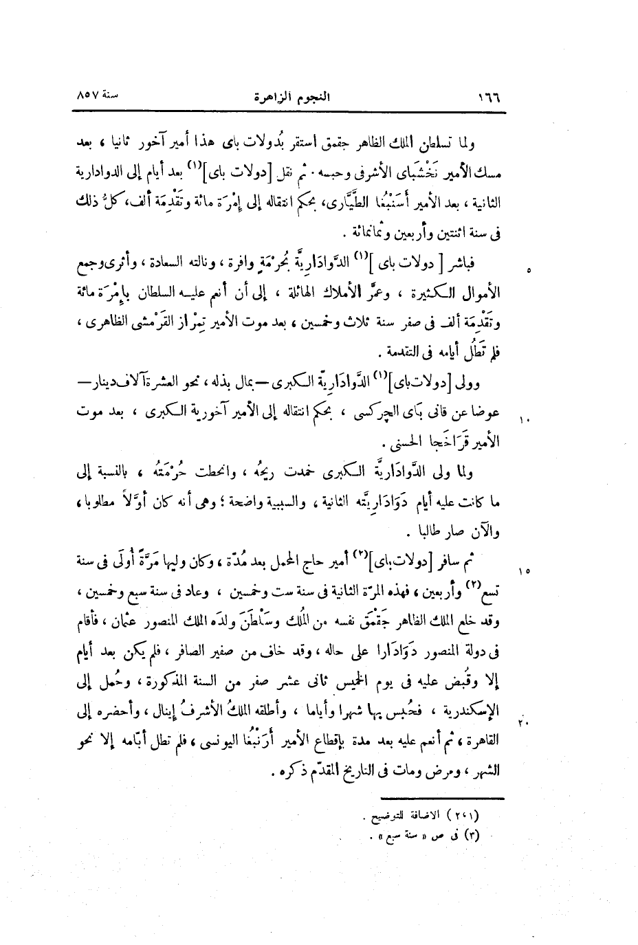 ولما تسلطن الملك الظاهر جقمق استقر بدولات باى هذا أمير آخور ثانيا، بعد مسك الأمير نخشباى الأشرفى وحبسه. ثم نقل [دولات باى] «1» بعد أيام إلى الدوادارية الثانية، بعد الأمير أسنبغا الطّيّارى، بحكم انتقاله إلى إمرة مائة وتقدمة ألف، كلّ ذلك فى سنة اثنتين وأربعين وثمانمائة.