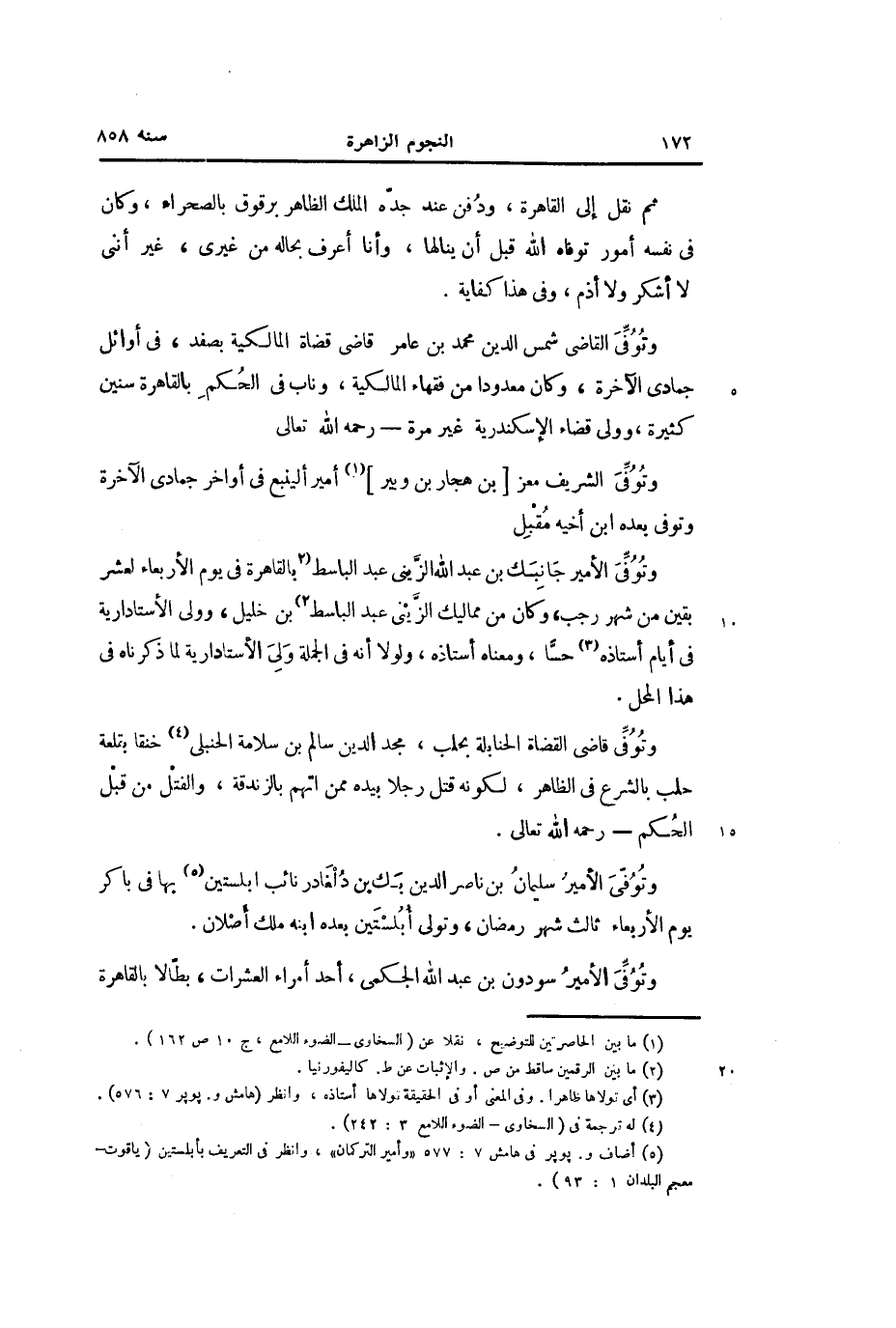 وتوفّى الأمير جانبك بن عبد الله الزّينى عبد الباسط «2» بالقاهرة في يوم الأربعاء لعشر بقين من شهر رجب، وكان من مماليك الزّينى عبد الباسط «3» بن خليل، وولى الأستادارية فى أيام أستاذه»