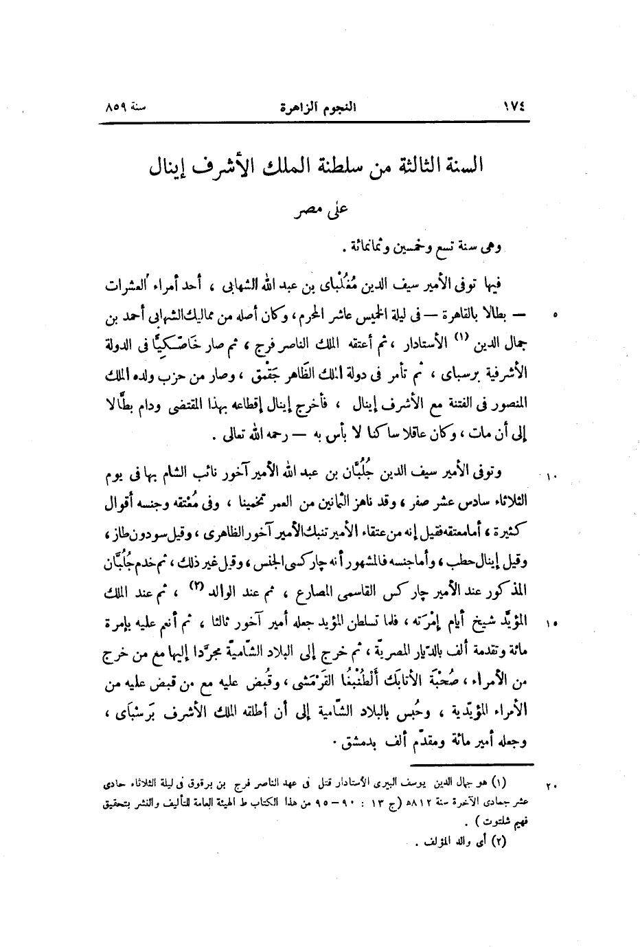 السنة الثالثة من سلطنة الملك الأشرف إينال على مصر وهى سنة تسع وخمسين وثمانمائة.