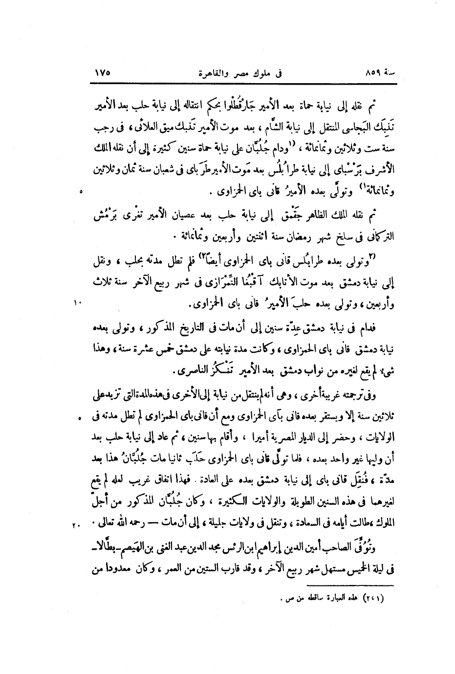 فدام في نيابة دمشق عدّة سنين إلى أن مات في التاريخ المذكور، وتولى بعده نيابة دمشق قانى باى الحمزاوى، وكانت مدة نيابته على دمشق خمس عشرة سنة، وهذا شىء لم يقع لغيره من نواب دمشق بعد الأمير تنكز الناصرى.