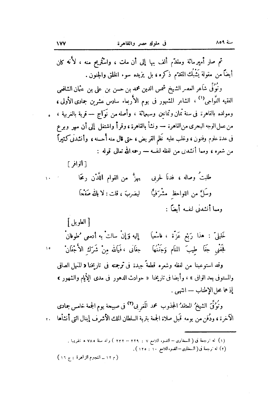 وتوفّى شاعر العصر الشيخ شمس الدين محمد بن حسن بن على بن عثمان الشافعى الفقيه النّواجى «1» ، الشاعر المشهور في يوم الأربعاء سادس عشرين جمادى الأولى، ومولده بالقاهرة في سنة ثمان وثمانين وسبعمائة، وأصله من نواج- قرية بالغربية، من عمل الوجه البحرى من القاهرة- ونشأ بالقاهرة، وقرأ واشتغل إلى أن مهر وبرع فى عدة علوم وفنون، وغلب عليه نظم القريض، حتى قال منه أحسنه، وأنشدنى كثيرا من شعره، ومما أنشدنى من لفظه لنفسه- رحمه الله تعالى قوله: