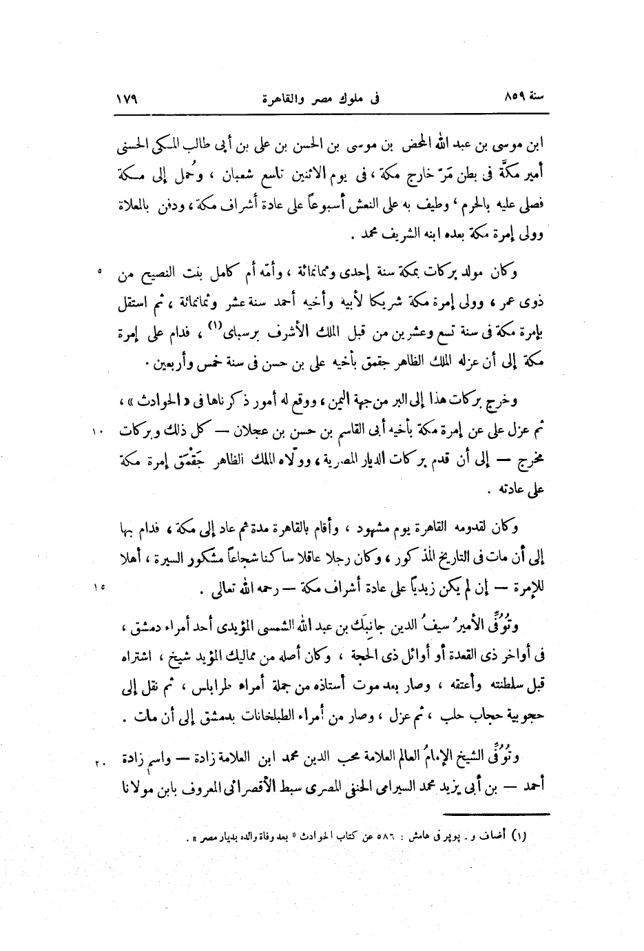 وكان مولد بركات بمكة سنة إحدى وثمانمائة، وأمّه أم كامل بنت النصيح من ذوى عمر، وولى إمرة مكة شريكا لأبيه وأخيه أحمد سنة عشر وثمانمائة، ثم استقل بإمرة مكة في سنة تسع وعشرين من قبل الملك الأشرف برسباى «1» ، فدام على إمرة مكة إلى أن عزله الملك الظاهر جقمق بأخيه على بن حسن في سنة خمس وأربعين.