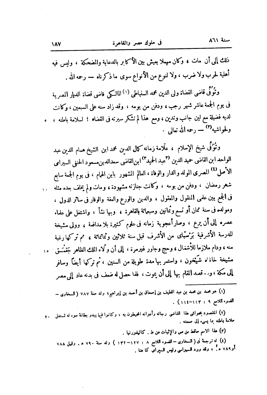 وتوفّى شيخ الإسلام، علّامة زمانه كمال الدين محمد ابن الشيخ همام الدين عبد الواحد ابن القاضى حميد الدين «3» عبد الحميد «4» ابن القاضى سعد الدين مسعود الحنفى السيرامى الأصل «5» المصرى المولد والدار والوفاة، العالم المشهور بابن الهمام، فى يوم الجمعة سابع شهر رمضان، ودفن من يومه، وكانت جنازته مشهودة، ومات ولم يخلف بعده مثله فى الجمع بين علمى المنقول والمعقول، والدين والورع والعفة والوقار في سائر الدول، ومولده في سنة ثمان أو تسع وثمانين وسبعمائة بالقاهرة، وبها نشأ، واشتغل على علماء عصره إلى أن برع، وصار أعجوبة زمانه في علوم كثيرة بلا مدافعة، وولى مشيخة المدرسة الأشرفية برسباى من الأشرف قبل سنة ثلاثين وثمانمائة، ثم تركها رغبة منه، ودام ملازما للأشغال، وحج وجاور غير مرة، إلى أن ولّاه الملك الظاهر جقمق مشيخة خانقاه شيخون، واستمر بها مدة طويلة من السنين، ثم تركها أيضا وسافر إلى مكة، وقد قصد المقام بها إلى أن يموت، فلما حصل له ضعف في بدنه عاد إلى مصر
