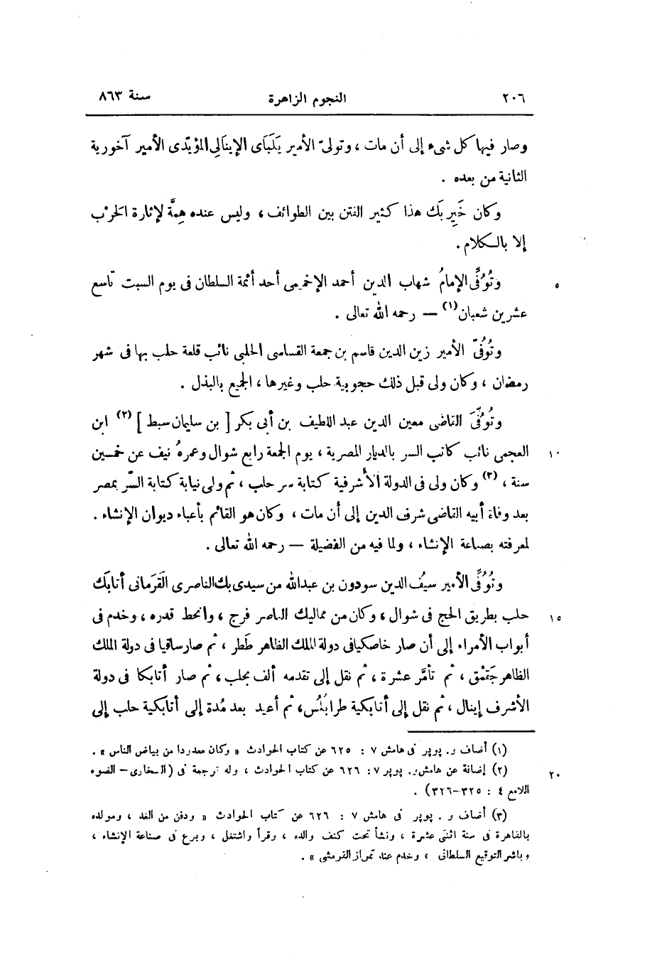 وتوفّى الأمير سيف الدين سودون بن عبد الله من سيدى بك الناصرى القرمانى أتابك حلب بطريق الحج في شوال، وكان من مماليك الناصر فرج، وانحط قدره، وخدم في أبواب الأمراء إلى أن صار خاصكيا في دولة الملك الظاهر ططر، ثم صار ساقيا في دولة الملك الظاهر جقمق، ثم تأمّر عشرة، ثم نقل إلى تقدمه ألف بحلب، ثم صار أتابكا في دولة الأشرف إينال، ثم نقل إلى أتابكية طرابلس، ثم أعيد بعد مدة إلى أتابكية حلب إلى