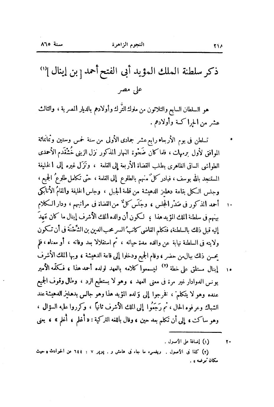 ذكر سلطنة الملك المؤيد أبى الفتح أحمد [بن إينال] «1» على مصر هو السلطان السابع والثلاثون من ملوك التّرك وأولادهم بالديار المصرية، والثالث عشر من الجراكسة وأولادهم.