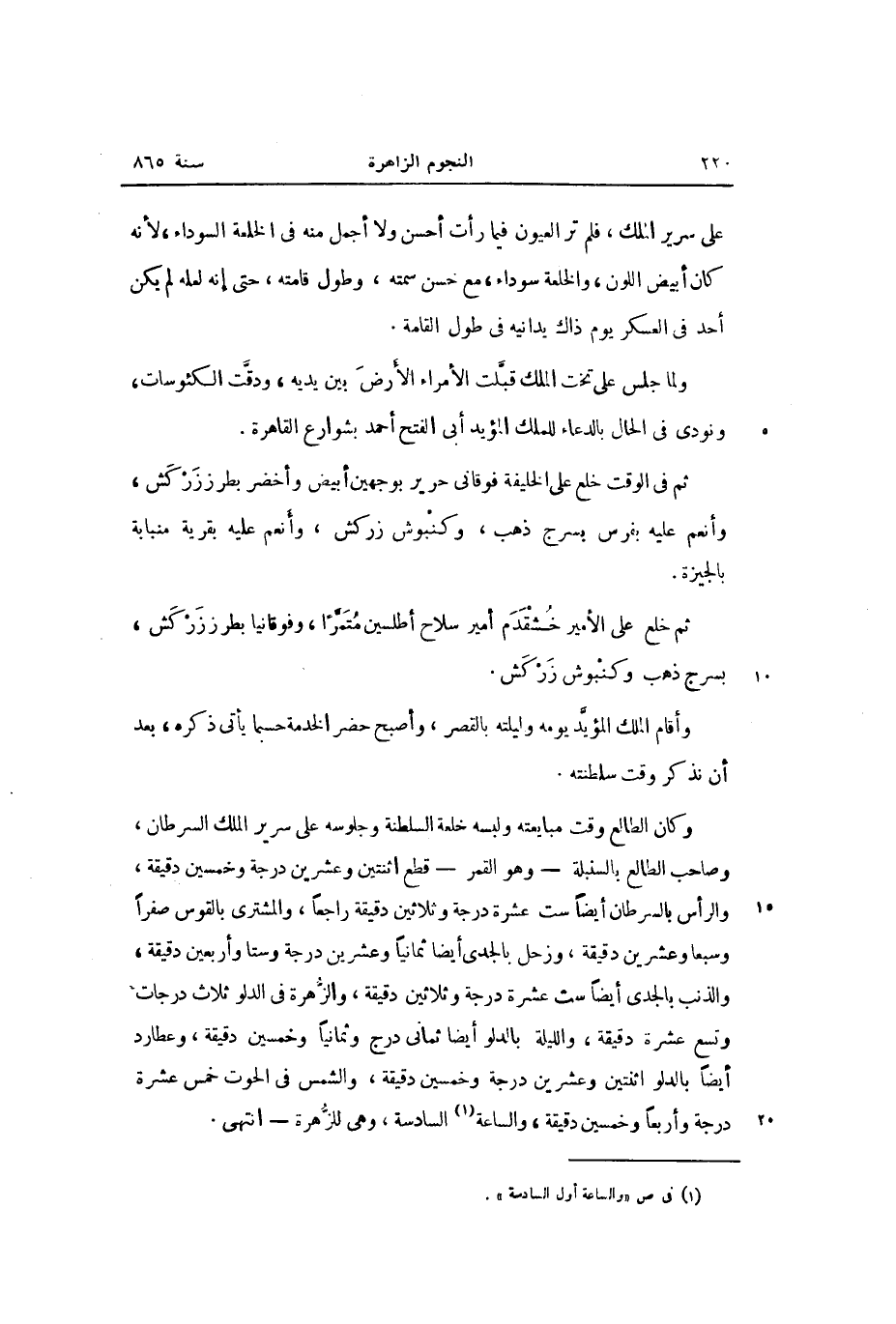 وكان الطالع وقت مبايعته ولبسه خلعة السلطنة وجلوسه على سرير الملك السرطان، وصاحب الطالع بالسنبلة- وهو القمر- قطع اثنتين وعشرين درجة وخمسين دقيقة، والرأس بالسرطان أيضا ست عشرة درجة وثلاثين دقيقة راجعا، والمشترى بالقوس صفرا وسبعا وعشرين دقيقة، وزحل بالجدى أيضا ثمانيا وعشرين درجة وستا وأربعين دقيقة، والذنب بالجدى أيضا ست عشرة درجة وثلاثين دقيقة، والزّهرة في الدلو ثلاث درجات وتسع عشرة دقيقة، والليلة بالدلو أيضا ثمانى درج وثمانيا وخمسين دقيقة، وعطارد أيضا بالدلو اثنتين وعشرين درجة وخمسين دقيقة، والشمس في الحوت خمس عشرة درجة وأربعا وخمسين دقيقة، والساعة «1» السادسة، وهى للزّهرة- انتهى.