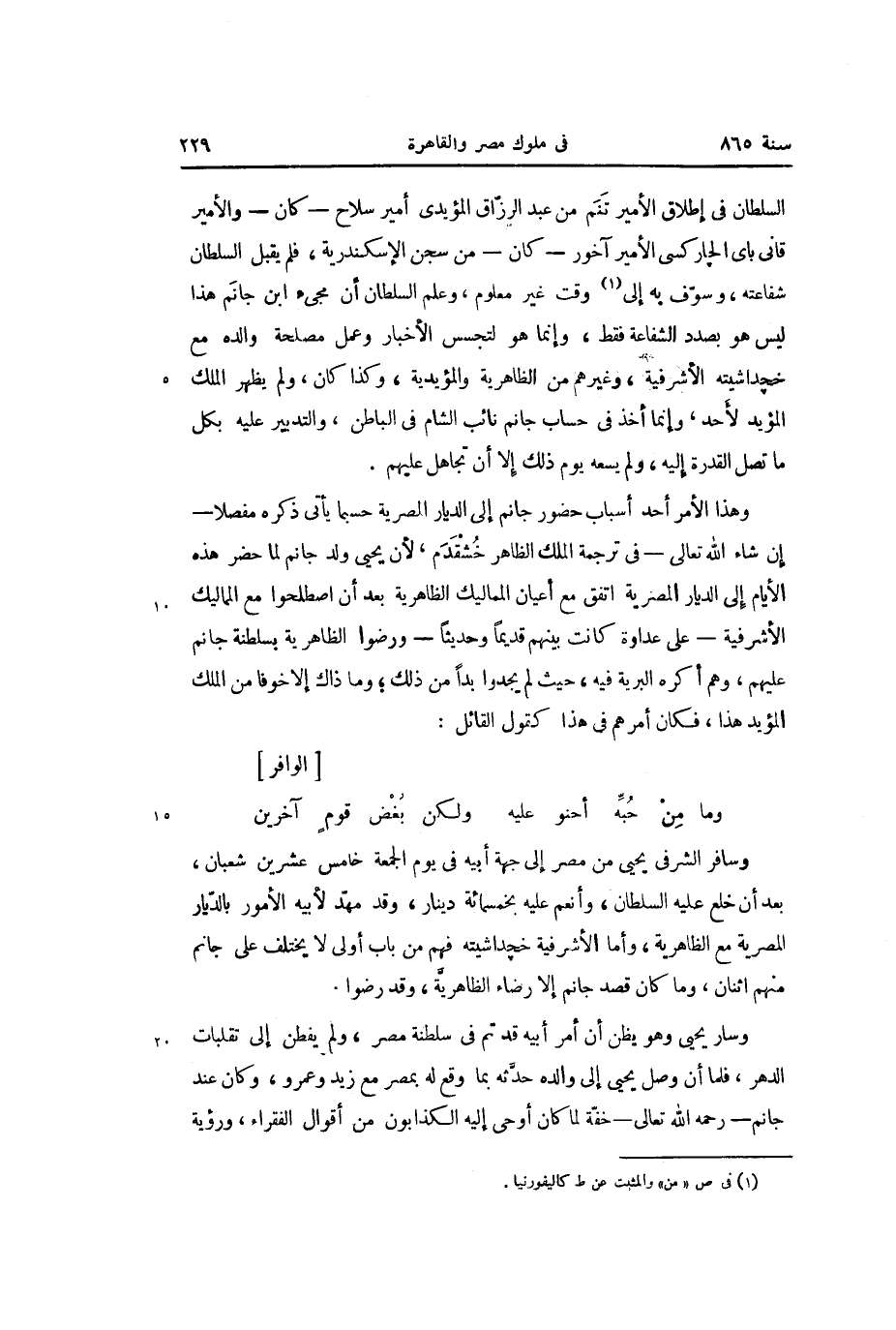 السلطان في إطلاق الأمير تنم من عبد الرزّاق المؤيدى أمير سلاح- كان- والأمير قانى باى الچاركسى الأمير آخور- كان- من سجن الإسكندرية، فلم يقبل السلطان شفاعته، وسوّف به إلى «1» وقت غير معلوم، وعلم السلطان أن مجىء ابن جانم هذا ليس هو بصدد الشفاعة فقط، وإنما هو لتجسس الأخبار وعمل مصلحة والده مع خچداشيته الأشرفية، وغيرهم من الظاهرية والمؤيدية، وكذا كان، ولم يظهر الملك المؤيد لأحد، وإنما أخذ في حساب جانم نائب الشام في الباطن، والتدبير عليه بكل ما تصل القدرة إليه، ولم يسعه يوم ذلك إلا أن تجاهل عليهم.