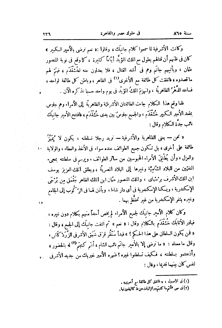 «فمن يكون السلطان على هذا الحكم؟» فبدأ سنقر قرق شبق الأشرفى الزّردكاش، وقال ما معناه: «ما نرضى إلا بالأمير جانم نائب الشام، أنتم كتبتم «2» له بالحضور، وأذعنتمو بسلطنته، فكيف تسلطنوا غيره؟ فنهره الأمير خيربك من جديد الأشرفى لنفس كان بينهما قديما، وقال: