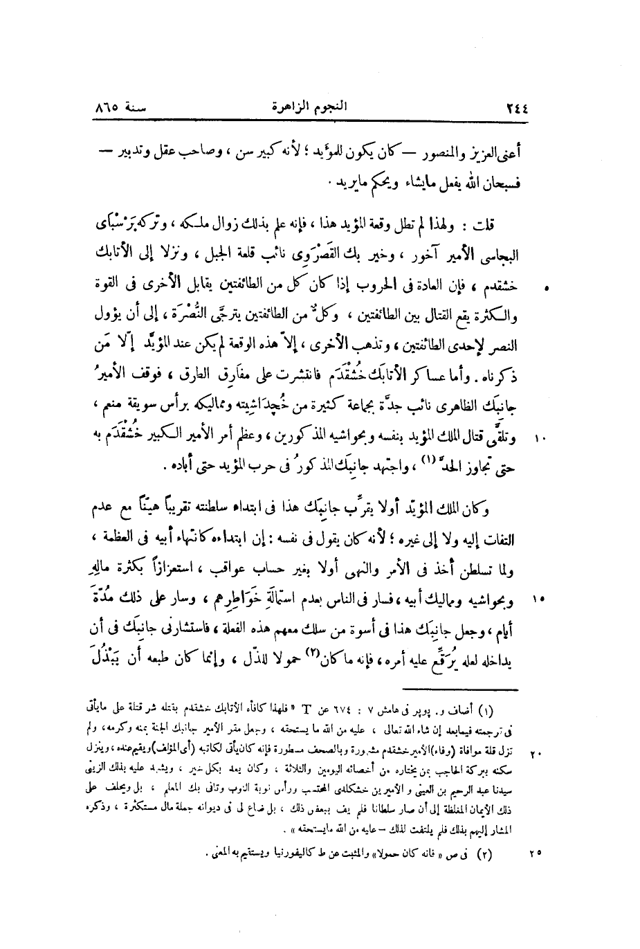وكان الملك المؤيّد أولا يقرّب جانبك هذا في ابتداء سلطنته تقريبا هيّنا مع عدم التفات إليه ولا إلى غيره؛ لأنه كان يقول في نفسه: إن ابتداءه كانتهاء أبيه في العظمة، ولما تسلطن أخذ في الأمر والنهى أولا بغير حساب عواقب، استعزازا بكثرة ماله وبحواشيه ومماليك أبيه، فسار في الناس بعدم استمالة خواطرهم، وسار على ذلك مدّة أيام، وجعل جانبك هذا في أسوة من سلك معهم هذه الفعلة، فاستشارنى جانبك في أن يداخله لعله يرقّع عليه أمره، فإنه ما كان «2» حمولا للذّل، وإنما كان طبعه أن يبذل