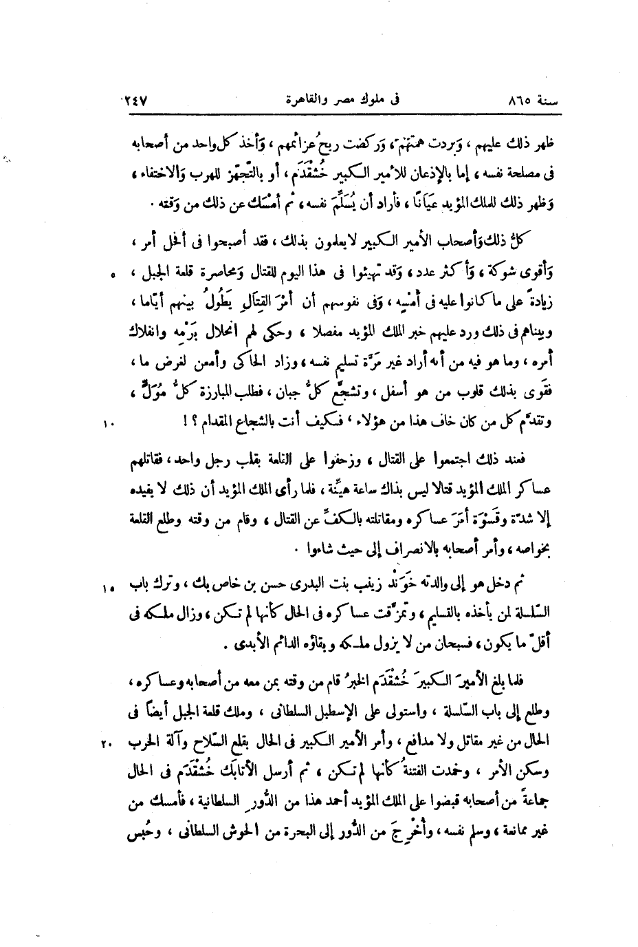 كلّ ذلك وأصحاب الأمير الكبير لا يعلمون بذلك، فقد أصبحوا في أفحل أمر، وأقوى شوكة، وأكثر عدد، وقد تهيئوا في هذا اليوم للقتال ومحاصرة قلعة الجبل، زيادة على ما كانوا عليه في أمسه، وفي نفوسهم أن أمر القتال يطول بينهم أيّاما، وبيناهم في ذلك ورد عليهم خبر الملك المؤيد مفصلا، وحكى لهم انحلال برمه وانفلاك أمره، وما هو فيه من أنه أراد غير مرّة تسليم نفسه، وزاد الحاكى وأمعن لغرض ما، فقوى بذلك قلوب من هو أسفل، وتشجّع كلّ جبان، فطلب المبارزة كلّ مولّ، وتقدّم كل من كان خاف هذا من هؤلاء، فكيف أنت بالشجاع المقدام؟!