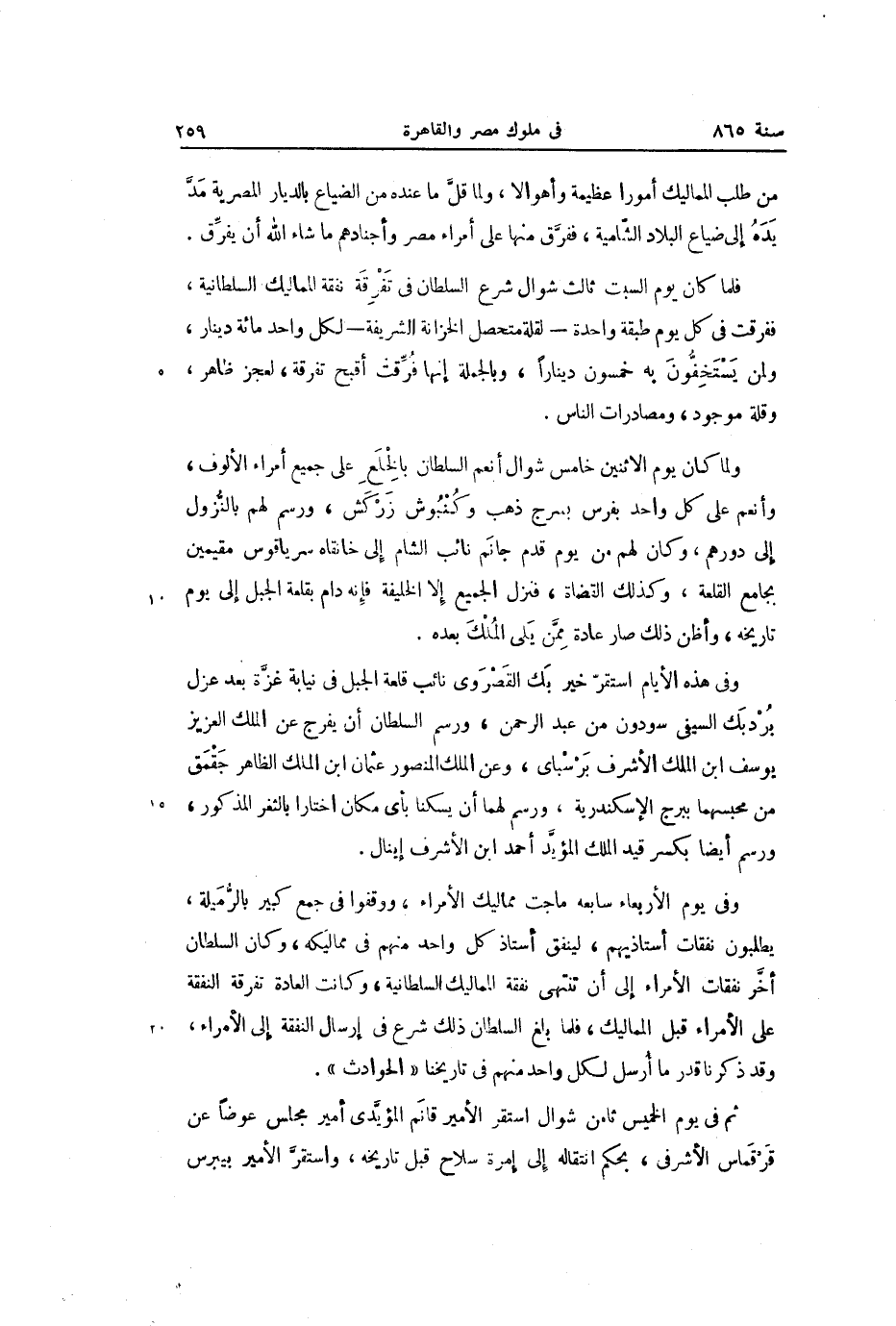 فلما كان يوم السبت ثالث شوال شرع السلطان في تفرقة نفقة المماليك السلطانية، ففرقت في كل يوم طبقة واحدة- لقلة متحصل الخزانة الشريفة- لكل واحد مائة دينار، ولمن يستخفّون به خمسون دينارا، وبالجملة إنها فرّقت أقبح تفرقة، لعجز ظاهر، وقلة موجود، ومصادرات الناس.