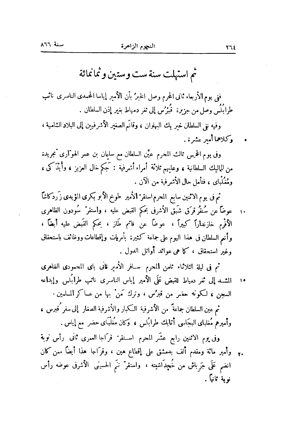 ثم استهلت سنة ست وستين وثمانمائة ففى يوم الأربعاء ثانى المحرم وصل الخبر بأن الأمير إياسا المحمدى الناصرى نائب طرابلس وصل من جزيرة قبرس إلى ثغر دمياط بغير إذن السلطان.