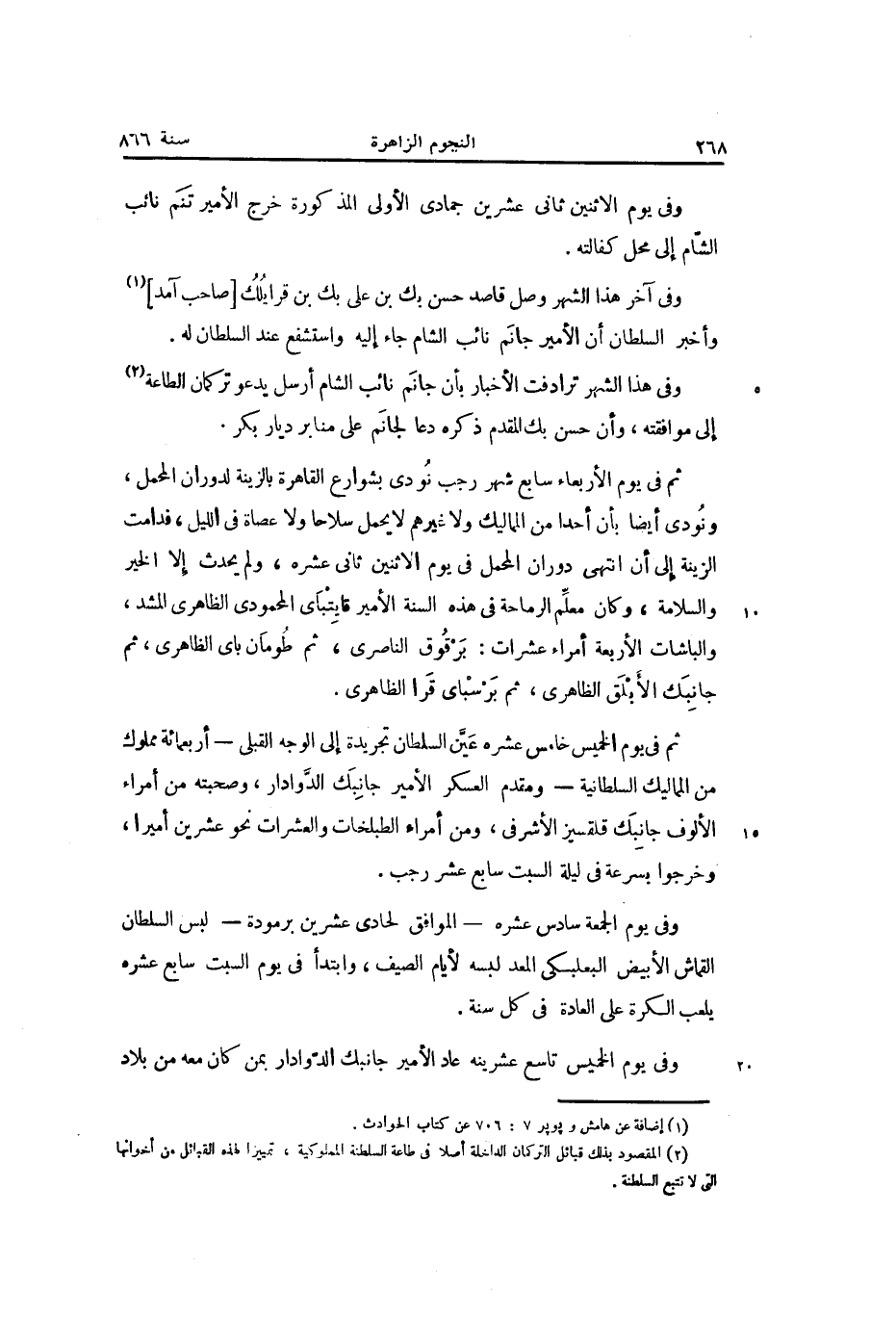 وفي هذا الشهر ترادفت الأخبار بأن جانم نائب الشام أرسل يدعو تركمان الطاعة «2» إلى موافقته، وأن حسن بك المقدم ذكره دعا لجانم على منابر ديار بكر.