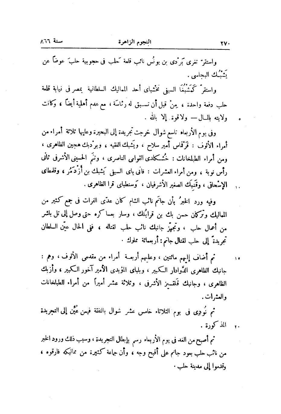 وفي يوم الأربعاء تاسع شوال خرجت تجريدة إلى البحيرة وعليها ثلاثة أمراء من أمراء الألوف: قرقماس أمير سلاح، ويشبك الفقيه، وبردبك هجين الظاهرى، ومن أمراء الطبلخانات: خشكلدى القوامى الناصرى، وتنم الحسينى الأشرفى ثانى رأس نوبة، ومن أمراء العشرات: قانى باى السيفى يشبك بن أزدمر، وقلمطاى الإسحاقى، وقنبك الصغير الأشرفيان، وسنطباى قرا الظاهرى.