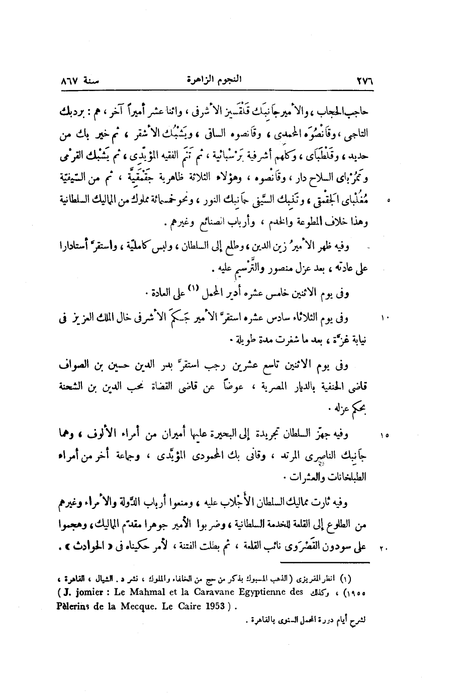 حاجب الحجاب، والأمير جانبك قلقسيز الأشرفى، واثنا عشر أميرا آخر، هم: بردبك التاجى، وقانصوه المحمدى، وقانصوه الساقى، ويشبك الأشقر، ثم خيربك من حديد، وقلطباى، وكلهم أشرفية برسبائية، ثم تنم الفقيه المؤيّدى، ثم يشبك القرمى وتمرباى السلاح دار، وقانصوه، وهؤلاء الثلاثة ظاهرية جقمقيّة، ثم من السّيفيّة مغلباى الجقمقى، وتنبك السّيفى جانبك النور، ونحو خمسمائة مملوك من المماليك السلطانية وهذا خلاف المطوعة والخدم، وأرباب الصنائع وغيرهم.