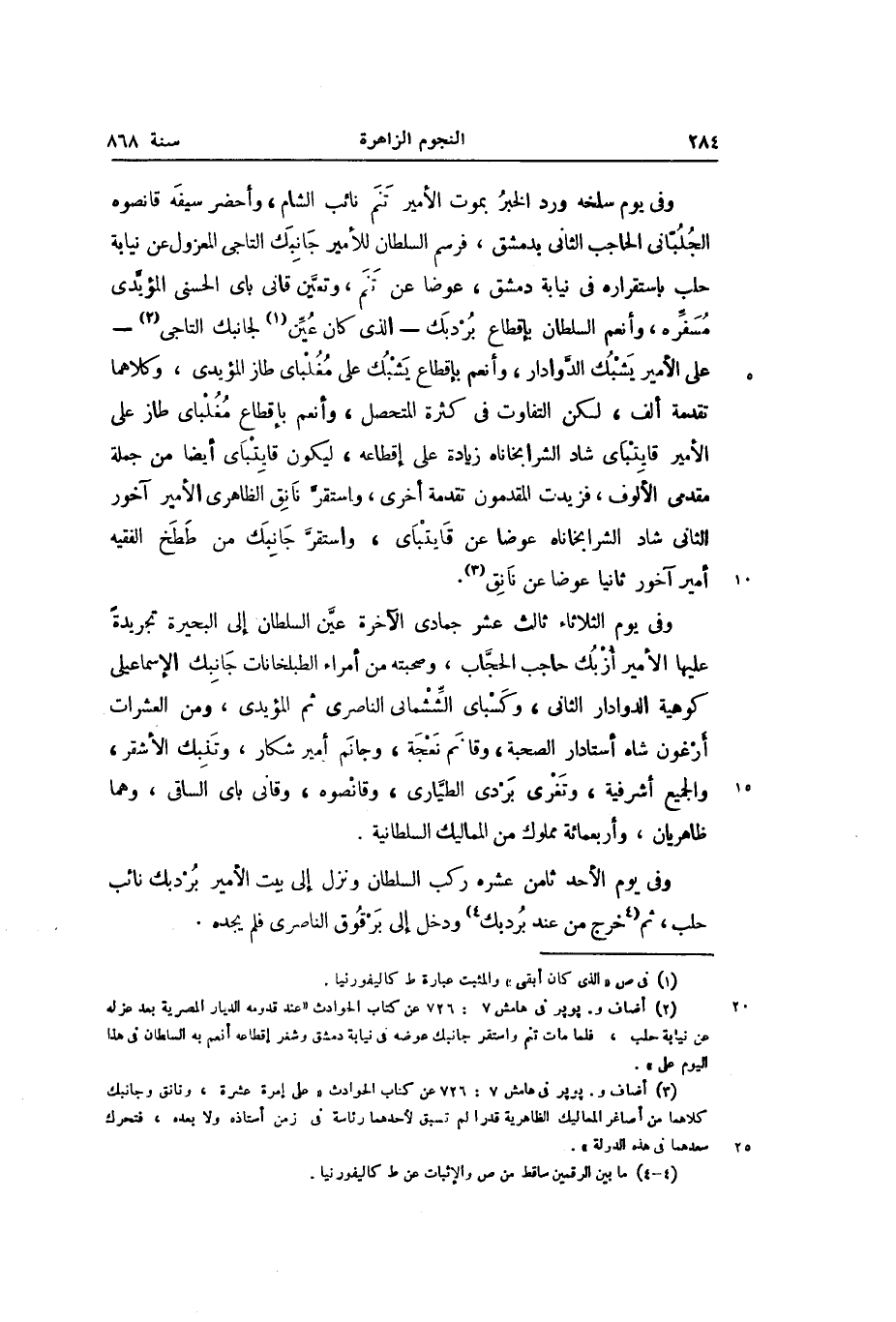 وفي يوم سلخه ورد الخبر بموت الأمير تنم نائب الشام، وأحضر سيفه قانصوه الجلبّانى الحاجب الثانى بدمشق، فرسم السلطان للأمير جانبك التاجى المعزول عن نيابة حلب باستقراره في نيابة دمشق، عوضا عن تنم، وتعيّن قانى باى الحسنى المؤيّدى مسفّره، وأنعم السلطان بإقطاع بردبك- الذي كان عيّن «1» لجانبك التاجى «2» - على الأمير يشبك الدّوادار، وأنعم بإقطاع يشبك على مغلباى طاز المؤيدى، وكلاهما تقدمة ألف، لكن التفاوت في كثرة المتحصل، وأنعم بإقطاع مغلباى طاز على الأمير قايتباى شاد الشرابخاناه زيادة على إقطاعه، ليكون قايتباى أيضا من جملة مقدمى الألوف، فزيدت المقدمون تقدمة أخرى، واستقرّ نانق الظاهرى الأمير آخور الثانى شاد الشرابخاناه عوضا عن قايتباى، واستقرّ جانبك من ططخ الفقيه أمير آخور ثانيا عوضا عن نانق «3» .