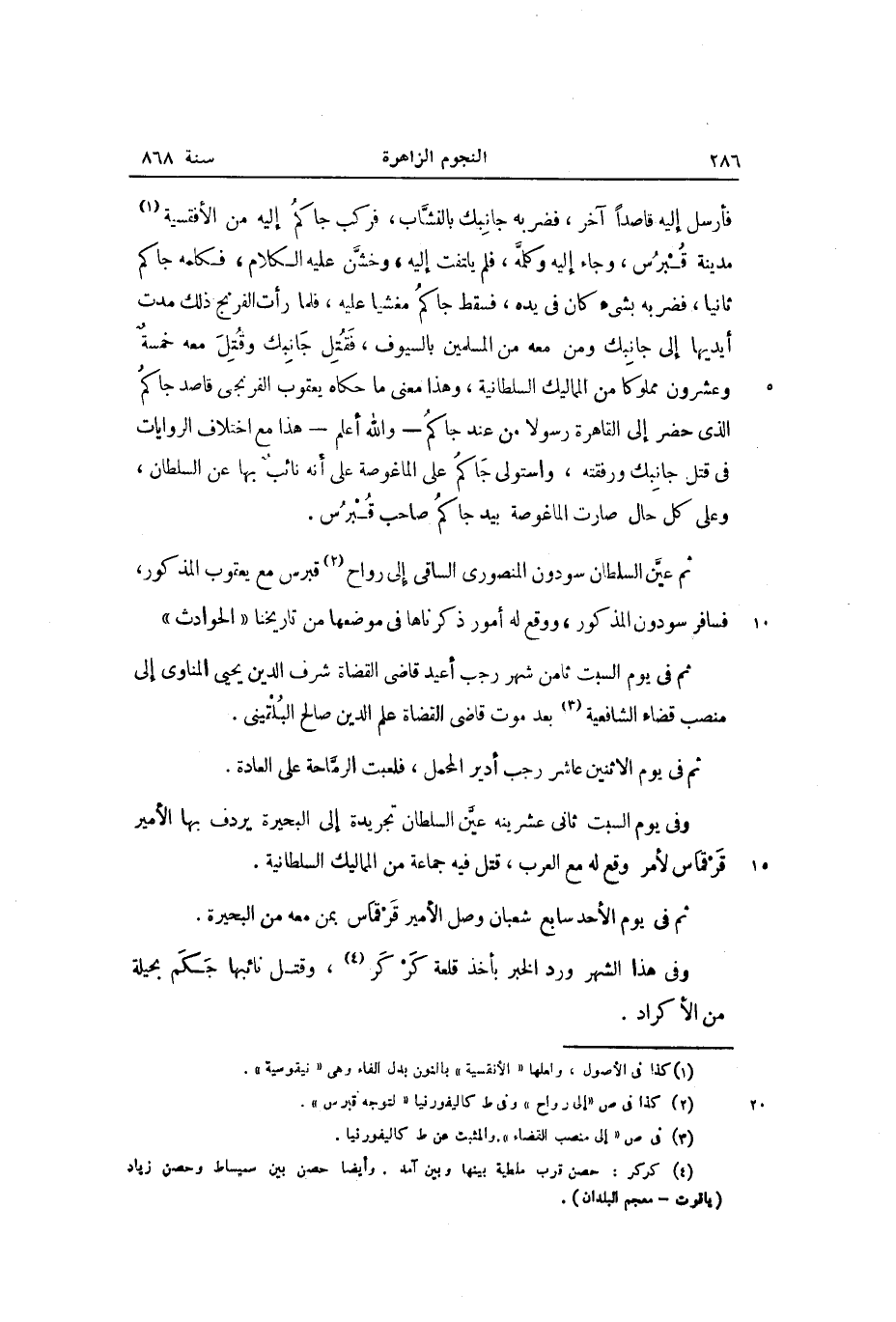 فأرسل إليه قاصدا آخر، فضربه جانبك بالنشّاب، فركب جاكم إليه من الأفقسية «1» مدينة قبرس، وجاء إليه وكلّمه، فلم يلتفت إليه، وخشّن عليه الكلام، فكلمه جاكم ثانيا، فضربه بشىء كان في يده، فسقط جاكم مغشيا عليه، فلما رأت الفرنج ذلك مدت أيديها إلى جانبك ومن معه من المسلمين بالسيوف، فقتل جانبك وقتل معه خمسة وعشرون مملوكا من المماليك السلطانية، وهذا معنى ما حكاه يعقوب الفرنجى قاصد جاكم الذي حضر إلى القاهرة رسولا من عند جاكم- والله أعلم- هذا مع اختلاف الروايات فى قتل جانبك ورفقته، واستولى جاكم على الماغوصة على أنه نائب بها عن السلطان، وعلى كل حال صارت الماغوصة بيد جاكم صاحب قبرس.