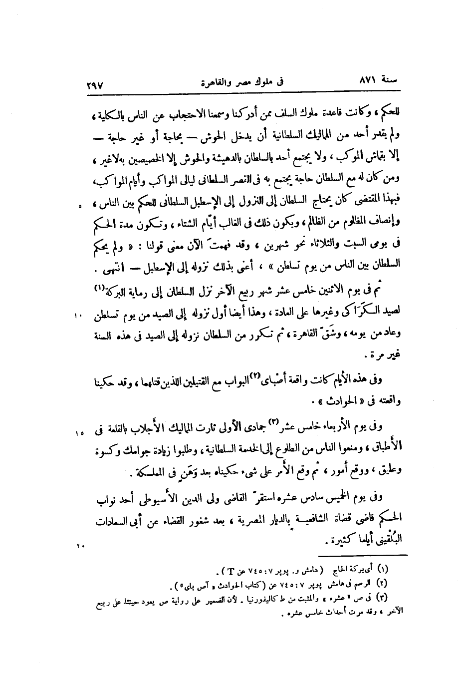 للحكم، وكانت قاعدة ملوك السلف ممن أدركنا وسمعنا الاحتجاب عن الناس بالكلية، ولم يقدر أحد من المماليك السلطانية أن يدخل الحوش- بحاجة أو غير حاجة- إلا بقماش الموكب، ولا يجتمع أحد بالسلطان بالدهيشة والحوش إلا الخصيصين به لا غير، ومن كان له مع السلطان حاجة يجتمع به في القصر السلطانى ليالى المواكب وأيام المواكب، فبهذا المقتضى كان يحتاج السلطان إلى النزول إلى الإسطبل السلطانى للحكم بين الناس، وإنصاف المظلوم من الظالم، ويكون ذلك في الغالب أيّام الشتاء، وتكون مدة الحكم فى يومى السبت والثلاثاء نحو شهرين، وقد فهمت الآن معنى قولنا: «ولم يحكم السلطان بين الناس من يوم تسلطن» ، أعنى بذلك نزوله إلى الإسطبل- انتهى.