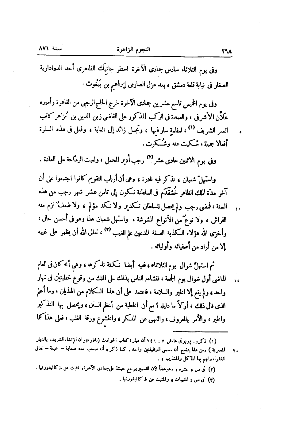 واستهلّ شعبان، نذكر فيه نادرة، وهى أن أرباب التقويم كانوا اجتمعوا على أن آخر مدّة الملك الظاهر خشقدم في السلطنة تكون إلى ثامن عشر شهر رجب من هذه السنة، فمضى رجب ولم يحصل للسلطان تكدير ولا نكد مؤلم، ولا ضعف لزم منه الفراش، ولا نوع من الأنواع المشوشة، واستهل شعبان هذا وهو في أحسن حال، وأخزى الله هؤلاء الكذبة الفسقة المدعين علم الغيب «3» ، تعالى الله أن يظهر على غيبه إلا من أراد من أصفيائه وأوليائه.