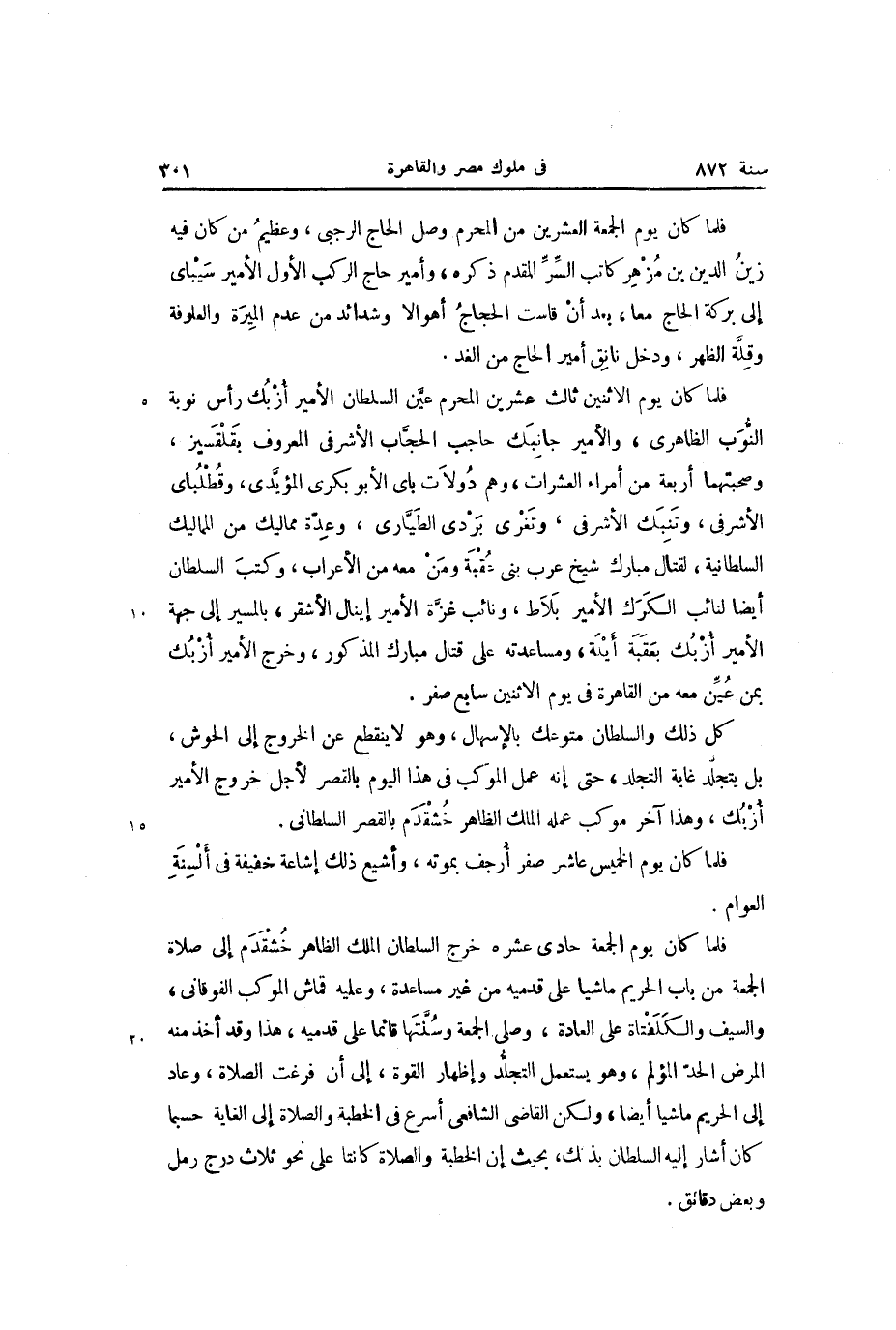 فلما كان يوم الجمعة العشرين من المحرم وصل الحاج الرجبى، وعظيم من كان فيه زين الدين بن مزهر كاتب السّرّ المقدم ذكره، وأمير حاج الركب الأول الأمير سيباى إلى بركة الحاج معا، بعد أن قاست الحجاج أهوالا وشدائد من عدم الميرة والعلوفة وقلّة الظهر، ودخل نانق أمير الحاج من الغد.