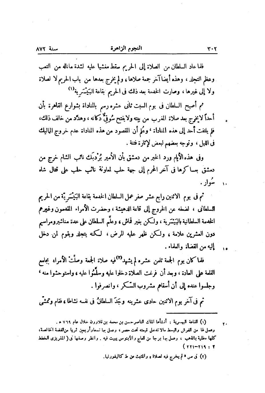 فلما عاد السلطان من الصلاة إلى الحريم سقط مغشيا عليه لشدة ما ناله من التعب وعظم التجلد، وهذه أيضا آخر جمعة صلاها، ولم يخرج بعدها من باب الحريم لا لصلاة ولا إلى غيرها، وصارت الخدمة بعد ذلك في الحريم بقاعة البيسرية «1»