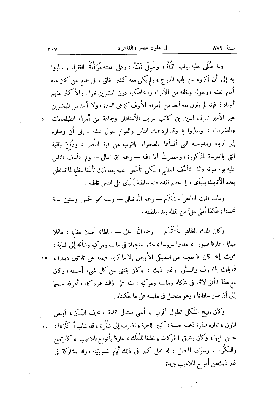 وكان الملك الظاهر خشقدم- رحمه الله تعالى- سلطانا جليلا عظيما، عاقلا مهابا، عارفا صبورا، مدبرا سيوسا، حشما متجملا في ملبسه ومركبه وشأنه إلى الغاية، بحيث إنه كان لا يعجبه من البعلبكى الأبيض إلا ما تزيد قيمته على ثلاثين دينارا، فما بالك بالصوف والسمّور وغير ذلك، وكان يقتنى من كل شىء أحسنه، وكان مع هذا التأنق لائقا في شكله وملبسه ومركبه، نشأ على ذلك عمره كله، أعرفه جنديا إلى أن صار سلطانا، وهو متجمل في ملبسه على ما حكيناه.