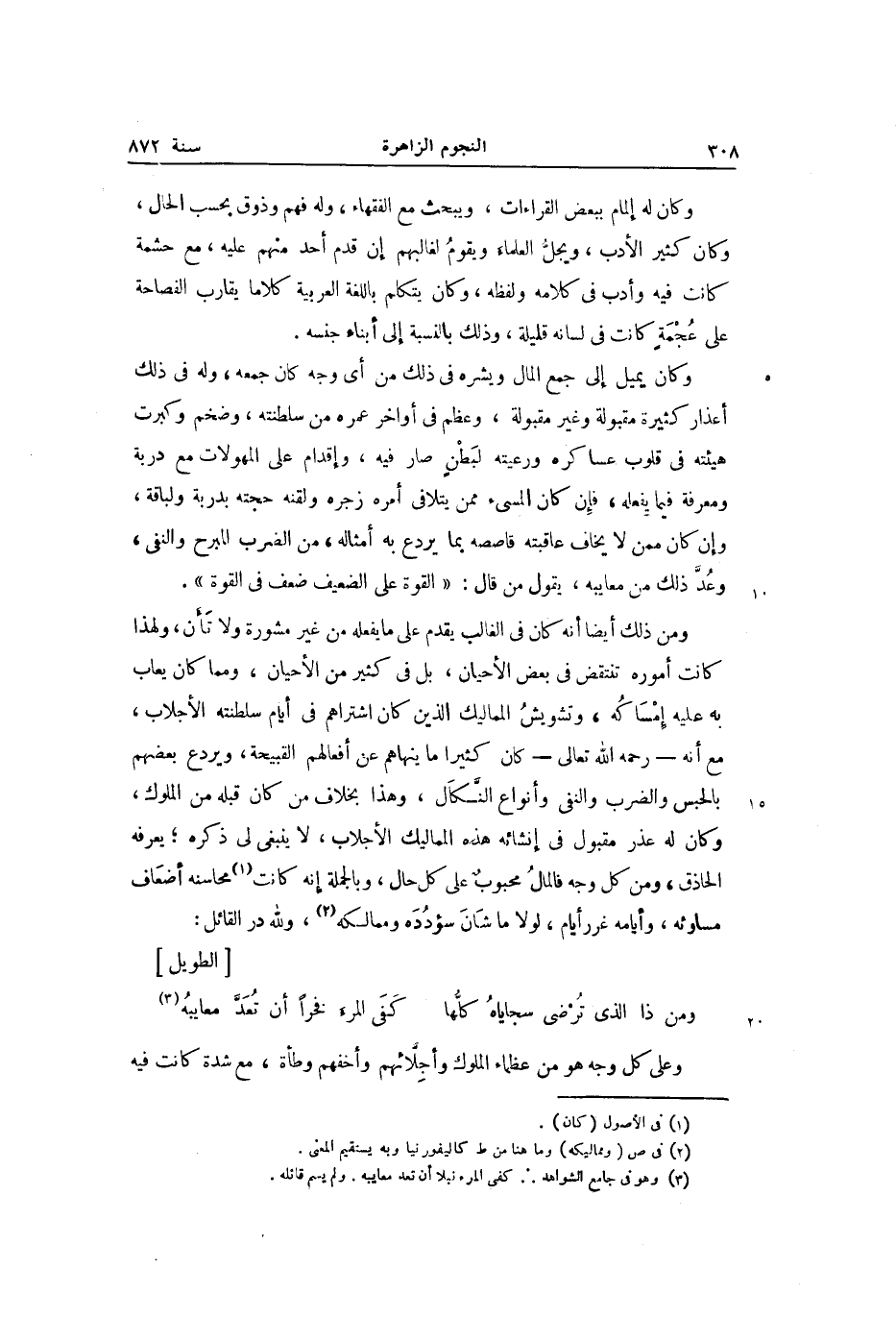 ومن ذلك أيضا أنه كان في الغالب يقدم على ما يفعله من غير مشورة ولا تأن، ولهذا كانت أموره تنتقض في بعض الأحيان، بل في كثير من الأحيان، ومما كان يعاب به عليه إمساكه، وتشويش المماليك الذين كان اشتراهم في أيام سلطنته الأجلاب، مع أنه- رحمه الله تعالى- كان كثيرا ما ينهاهم عن أفعالهم القبيحة، ويردع بعضهم بالحبس والضرب والنفى وأنواع النّكال، وهذا بخلاف من كان قبله من الملوك، وكان له عذر مقبول في إنشائه هذه المماليك الأجلاب، لا ينبغى لى ذكره؛ يعرفه الحاذق، ومن كل وجه فالمال محبوب على كل حال، وبالجملة إنه كانت «1» محاسنه أضعاف مساوئه، وأيامه غرر أيام، لولا ما شان سؤدده وممالكه «2» ، ولله در القائل: