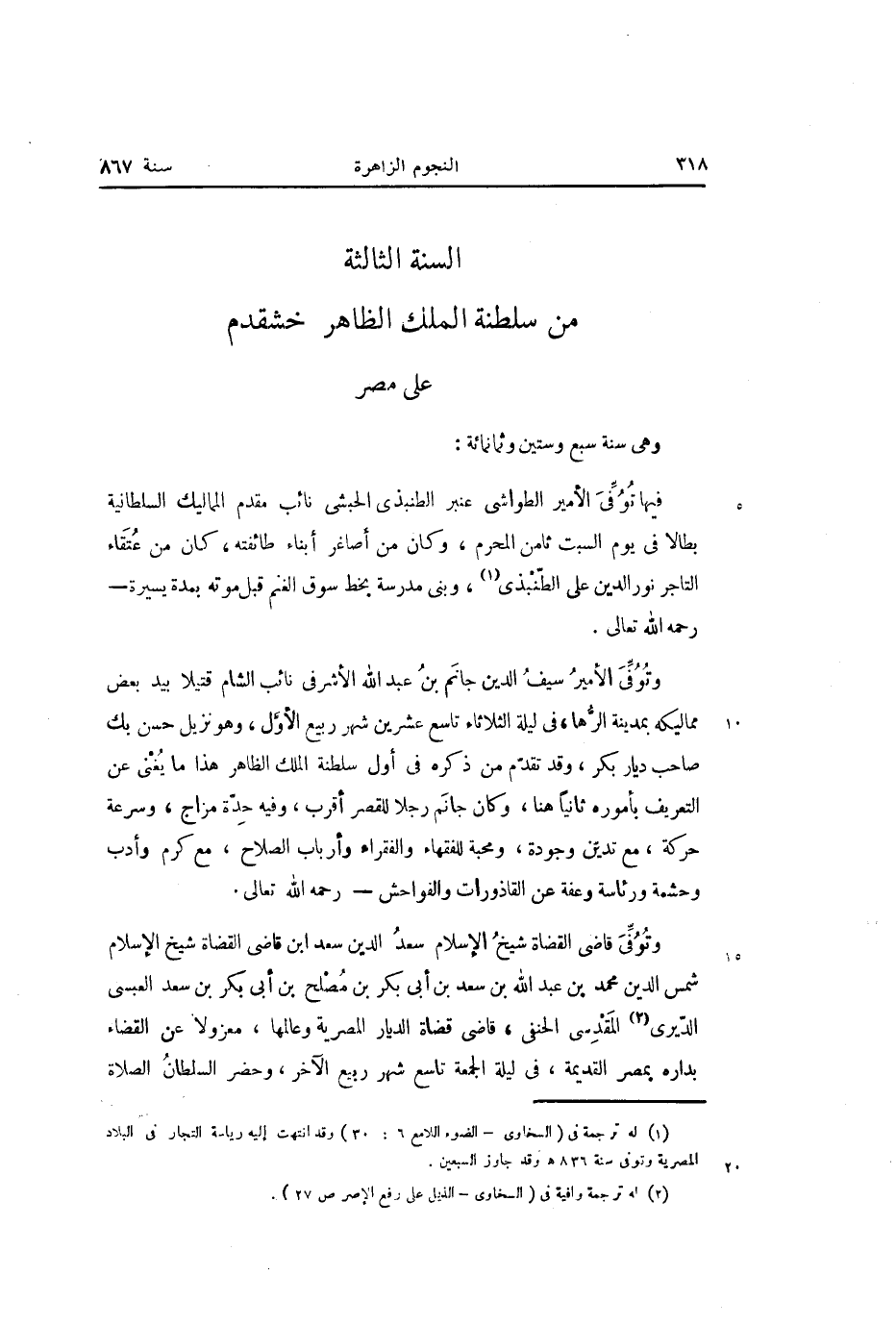 السنة الثالثة من سلطنة الملك الظاهر خشقدم على مصر وهى سنة سبع وستين وثمانمائة: