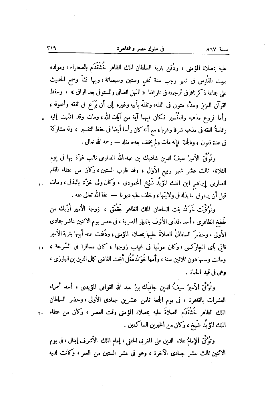 وتوفّى الأمير سيف الدين شادبك بن عبد الله الصارمى نائب غزّة بها في يوم الثلاثاء ثالث عشر شهر ربيع الأوّل، وقد قارب الستين، وكان من عتقاء المقام الصارمى إبراهيم ابن الملك المؤيّد شيخ المحمودى، وكان ولى غزّة بالبذل، ومات قبل أن يستوفى ما بذله في ولايتها، وخلف عليه ديونا- عفا الله تعالى عنه.