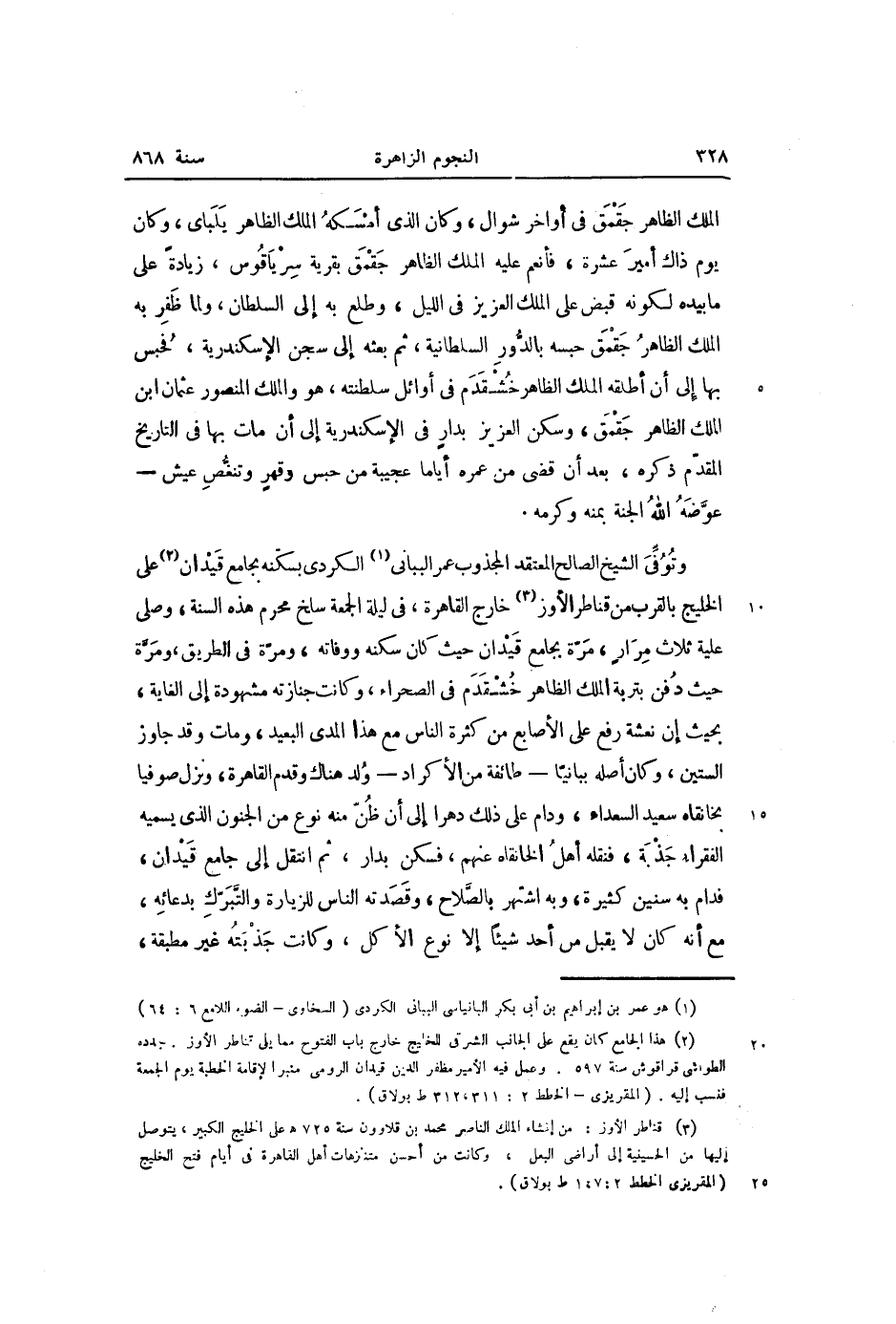 وتوفّى الشيخ الصالح المعتقد المجذوب عمر الببانى «1» الكردى بسكنه بجامع قيدان «2» على الخليج بالقرب من قناطر الأوز «3» خارج القاهرة، فى ليلة الجمعة سلخ محرم هذه السنة، وصلى عليه ثلاث مرار، مرّة بجامع قيدان حيث كان سكنه ووفاته، ومرّة في الطريق، ومرّة حيث دفن بتربة الملك الظاهر خشقدم في الصحراء، وكانت جنازته مشهودة إلى الغاية، بحيث إن نعشة رفع على الأصابع من كثرة الناس مع هذا المدى البعيد، ومات وقد جاوز الستين، وكان أصله ببانيّا- طائفة من الأكراد- ولد هناك وقدم القاهرة، ونزل صوفيا بخانقاه سعيد السعداء، ودام على ذلك دهرا إلى أن ظنّ منه نوع من الجنون الذي يسميه الفقراء جذبة، فنقله أهل الخانقاه عنهم، فسكن بدار، ثم انتقل إلى جامع قيدان، فدام به سنين كثيرة، وبه اشتهر بالصّلاح، وقصدته الناس للزيارة والتّبرّك بدعائه، مع أنه كان لا يقبل من أحد شيئا إلا نوع الأكل، وكانت جذبته غير مطبقة،