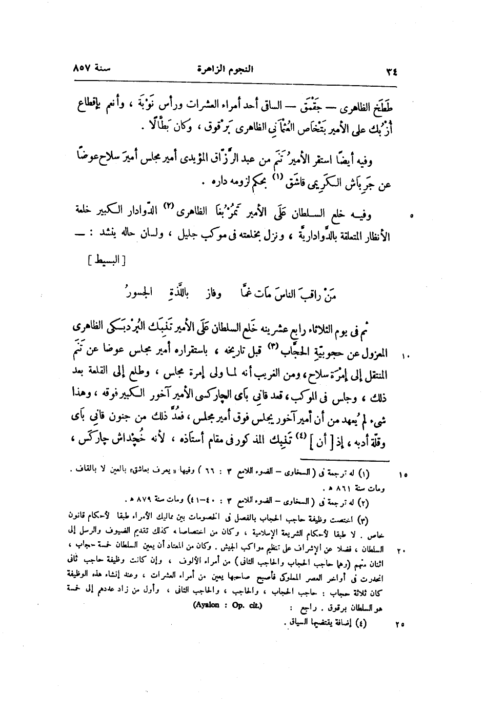 ثم في يوم الثلاثاء رابع عشرينه خلع السلطان على الأمير تنبك البردبكى الظاهرى المعزول عن حجوبيّة الحجّاب «3» قبل تاريخه، باستقراره أمير مجلس عوضا عن تنم المنتقل إلى إمرة سلاح، ومن الغريب أنه لما ولى إمرة مجلس، وطلع إلى القلعة بعد ذلك، وجلس في الموكب، قعد قانى باى الچاركسى الأمير آخور الكبير فوقه، وهذا شىء لم يعهد من أن أمير آخور يجلس فوق أمير مجلس، فعدّ ذلك من جنون قانى باى وقلّة أدبه، إذ [أن] «4» تنبك المذكور في مقام أستاذه، لأنه خچداش چاركس،