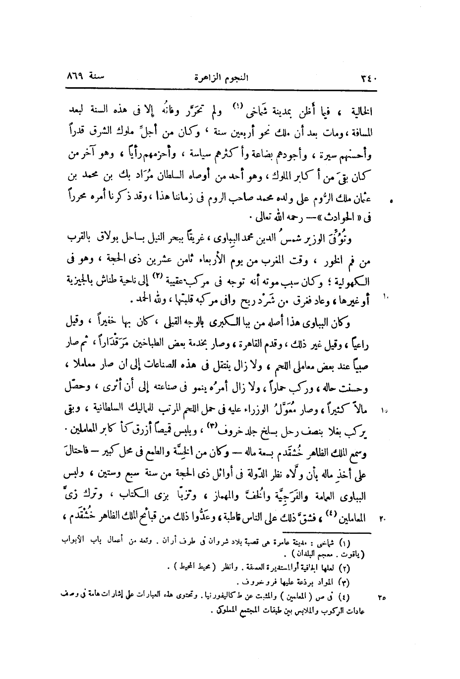 وسمع الملك الظاهر خشقدم بسعة ماله- وكان من الخسّة والطمع في محل كبير- فاحتال على أخذ ماله بأن ولّاه نظر الدّولة في أوائل ذى الحجة من سنة سبع وستين، ولبس البباوى العمامة والفرجيّة والخفّ والمهماز، وتزيّا بزى الكتاب، وترك زىّ المعاملين «4» ، فشقّ ذلك على الناس قاطبة، وعدّوا ذلك من قبائح الملك الظاهر خشقدم،