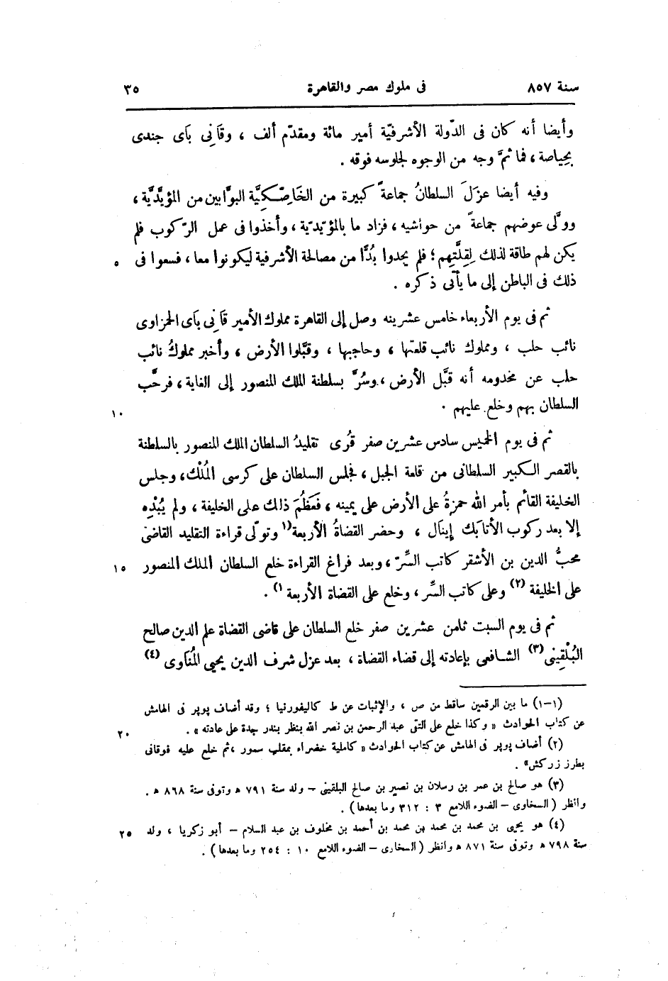 ثم في يوم السبت ثامن عشرين صفر خلع السلطان على قاضى القضاة علم الدين صالح البلقينى «4» الشافعى بإعادته إلى قضاء القضاة، بعد عزل شرف الدين يحيى المناوى «5»