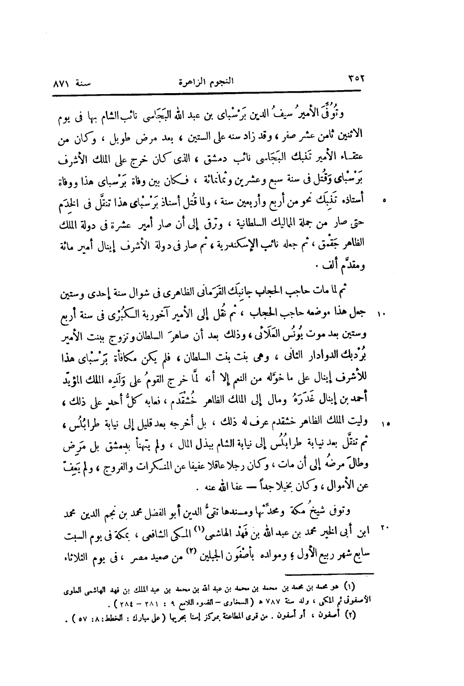 ثم لما مات حاجب الحجاب جانبك القرمانى الظاهرى في شوال سنة إحدى وستين جعل هذا موضعه حاجب الحجاب، ثم نقل إلى الأمير آخورية الكبرى في سنة أربع وستين بعد موت يونس العلائى، وذلك بعد أن صاهر السلطان وتزوج بنت الأمير بردبك الدوادار الثانى، وهى بنت بنت السلطان، فلم يكن مكافأة برسباى هذا للأشرف إينال على ما خوّله من النعم إلا أنه لمّا خرج القوم على ولده الملك المؤيّد أحمد بن إينال غدره ومال إلى الملك الظاهر خشقدم، فعابه كلّ أحد على ذلك، وليت الملك الظاهر خشقدم عرف له ذلك، بل أخرجه بعد قليل إلى نيابة طرابلس، ثم تنقّل بعد نيابة طرابلس إلى نيابة الشام ببذل المال، ولم يتهنأ بدمشق بل مرض وطال مرضه إلى أن مات، وكان رجلا عاقلا عفيفا عن المنكرات والفروج، ولم يعفّ عن الأموال، وكان بخيلا جدا- عفا الله عنه.