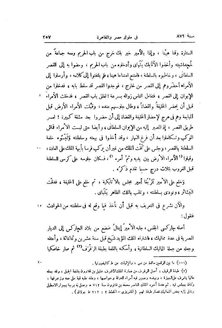 الستارة وقتا هيّنا، وإذا بالأمير خيربك خرج من باب الحريم ومعه جماعة من خچداشيته وأخذوا الأتابك يلباى وأدخلوه من باب الحريم، ومضوا به إلى القصر السلطانى، وخاطبوه بالسلطنة، فامتنع امتناعا هينا، فلم يلتفتوا إلى كلامه، وأرسلوا إلى الأمراء أحضروهم إلى القصر من خارج، فوجدوا القصر قد سقط بابه، فدخلوا من الإيوان إلى القصر، فتفاءل الناس زواله بسرعة؛ لغلق باب القصر، فدخلت الأمراء قبل أن يحضر الخليفة والقضاة، وطال جلوسهم عنده، وقبّلت الأمراء الأرض قبل المبايعة وهم في هرج لإحضار الخليفة والقضاة إلى أن حضروا بعد مشقة كبيرة؛ لعسر طريق القصر، إذ المصير إليه من الإيوان السلطانى، وأيضا حتى لبست الأمراء قماش الموكب وتكاملوا بعد أن فرغ النهار، وقد أخذوا في بيعته وسلطنته ولبّسوه خلعة السلطنة بالقصر، وجلس على تخت الملك من غير أن يركب فرسا بأبهة الملك على العادة، وقبلوا «1» الأمراء الأرض بين يديه وتمّ أمره «2» ، فكان جلوسه على كرسى السلطنة قبل الغروب بثلاث درج حسبما تقدم ذكره.