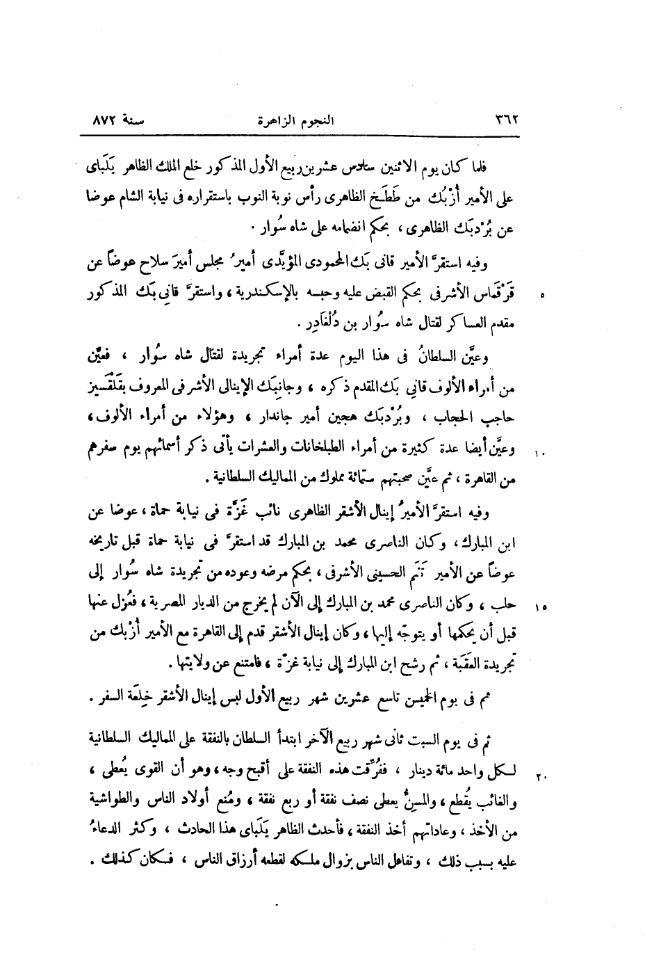 وفيه استقرّ الأمير إينال الأشقر الظاهرى نائب غزّة في نيابة حماة، عوضا عن ابن المبارك، وكان الناصرى محمد بن المبارك قد استقرّ في نيابة حماة قبل تاريخه عوضا عن الأمير تنم الحسينى الأشرفى، بحكم مرضه وعوده من تجريدة شاه سوار إلى حلب، وكان الناصرى محمد بن المبارك إلى الآن لم يخرج من الديار المصرية، فعزل عنها قبل أن يحكمها أو يتوجّه إليها، وكان إينال الأشقر قدم إلى القاهرة مع الأمير أزبك من تجريدة العقبة، ثم رشح ابن المبارك إلى نيابة غزّة، فامتنع عن ولايتها.