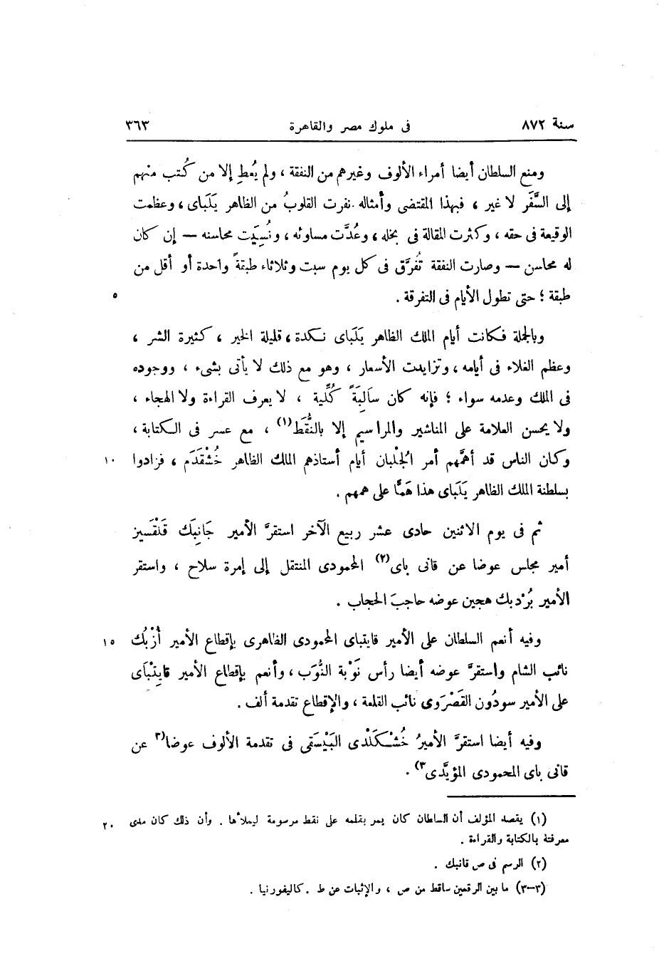 وبالجملة فكانت أيام الملك الظاهر يلباى نكدة، قليلة الخير، كثيرة الشر، وعظم الغلاء في أيامه، وتزايدت الأسعار، وهو مع ذلك لا يأتى بشىء، ووجوده فى الملك وعدمه سواء؛ فإنه كان سالبة كليّة، لا يعرف القراءة ولا الهجاء، ولا يحسن العلامة على المناشير والمراسيم إلا بالنّقط «1» ، مع عسر في الكتابة، وكان الناس قد أهمّهم أمر الجلبان أيام أستاذهم الملك الظاهر خشقدم، فزادوا بسلطنة الملك الظاهر يلباى هذا همّا على همهم.