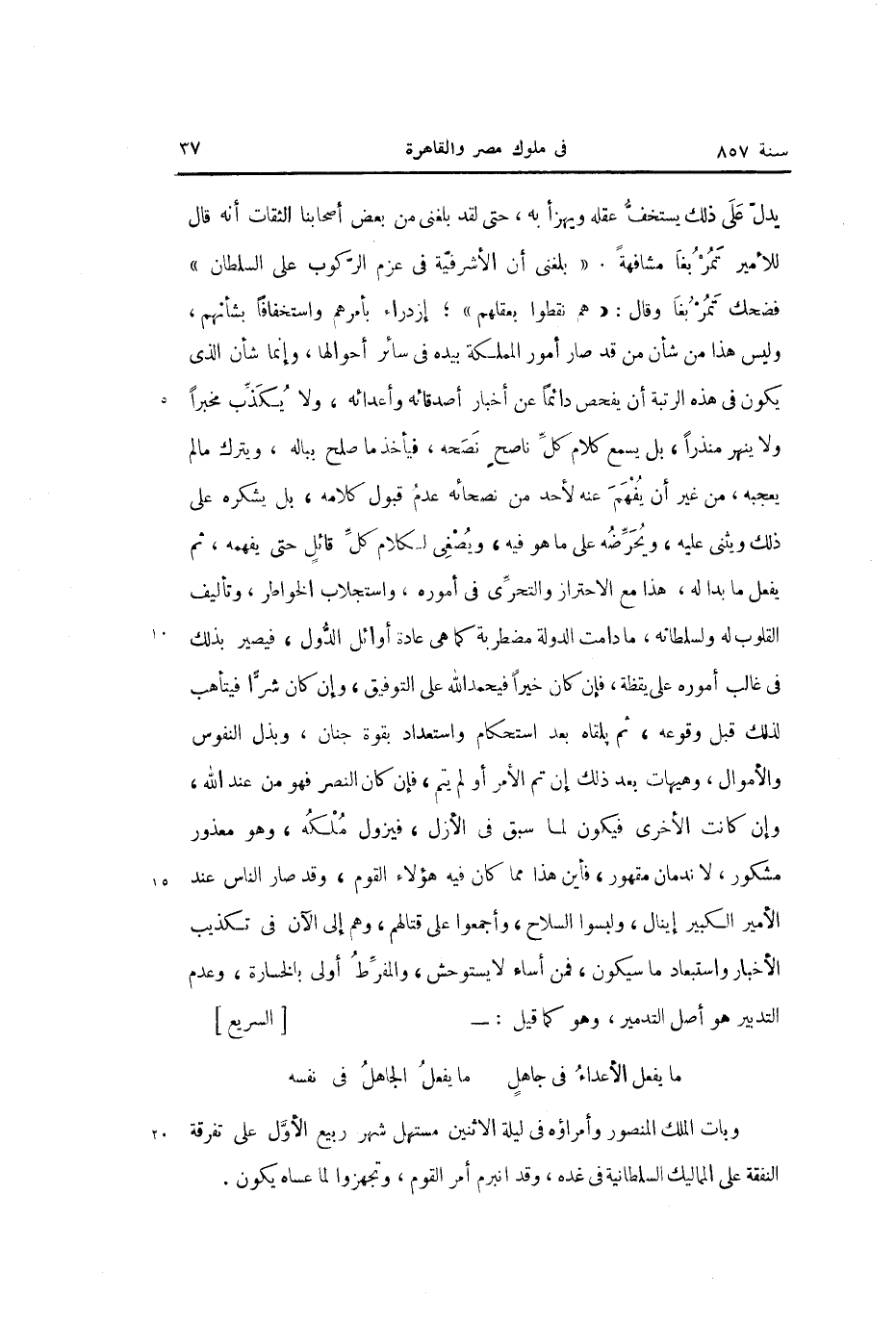 يدلّ على ذلك يستخفّ عقله ويهزأ به، حتى لقد بلغنى من بعض أصحابنا الثقات أنه قال للأمير تمربغا مشافهة. «بلغنى أن الأشرفيّة في عزم الرّكوب على السلطان» فضحك تمربغا وقال: «هم نقطوا بعقلهم» ؛ ازدراء بأمرهم واستخفافا بشأنهم، وليس هذا من شأن من قد صار أمور المملكة بيده في سائر أحوالها، وإنما شأن الذي يكون في هذه الرتبة أن يفحص دائما عن أخبار أصدقائه وأعدائه، ولا يكذّب مخبرا ولا ينهر منذرا، بل يسمع كلام كلّ ناصح نصحه، فيأخذ ما صلح بباله، ويترك ما لم يعجبه، من غير أن يفهم عنه لأحد من نصحائه عدم قبول كلامه، بل يشكره على ذلك ويثنى عليه، ويحرّضه على ما هو فيه، ويصغى لكلام كلّ قائل حتى يفهمه، ثم يفعل ما بدا له، هذا مع الاحتراز والتحرّى في أموره، واستجلاب الخواطر، وتأليف القلوب له ولسلطانه، ما دامت الدولة مضطربة كما هى عادة أوائل الدّول، فيصير بذلك فى غالب أموره على يقظة، فإن كان خيرا فيحمد الله على التوفيق، وإن كان شرّا فيتأهب لذلك قبل وقوعه، ثم بلقاه بعد استحكام واستعداد بقوة جنان، وبذل النفوس والأموال، وهيهات بعد ذلك إن تم الأمر أو لم يتم، فإن كان النصر فهو من عند الله، وإن كانت الأخرى فيكون لما سبق في الأزل، فيزول ملكه، وهو معذور مشكور، لاندمان مقهور، فأين هذا مما كان فيه هؤلاء القوم، وقد صار الناس عند الأمير الكبير إينال، ولبسوا السلاح، وأجمعوا على قتالهم، وهم إلى الآن في تكذيب الأخبار واستبعاد ما سيكون، فمن أساء لا يستوحش، والمفرّط أولى بالخسارة، وعدم التدبير هو أصل التدمير، وهو كما قيل:-[السريع]