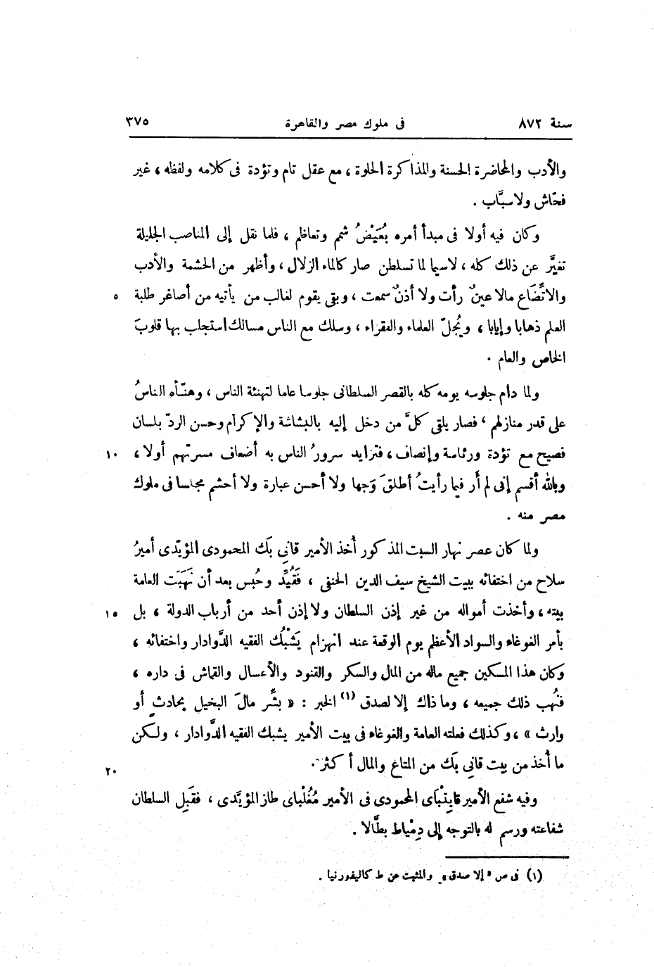 ولما دام جلوسه يومه كله بالقصر السلطانى جلوسا عاما لتهنئة الناس، وهنّأه الناس على قدر منازلهم، فصار يلقى كلّ من دخل إليه بالبشاشة والإكرام وحسن الردّ بلسان فصيح مع تؤدة ورئاسة وإنصاف، فتزايد سرور الناس به أضعاف مسرتهم أولا، وبالله أقسم إنى لم أر فيما رأيت أطلق وجها ولا أحسن عبارة ولا أحشم مجلسا في ملوك مصر منه.
