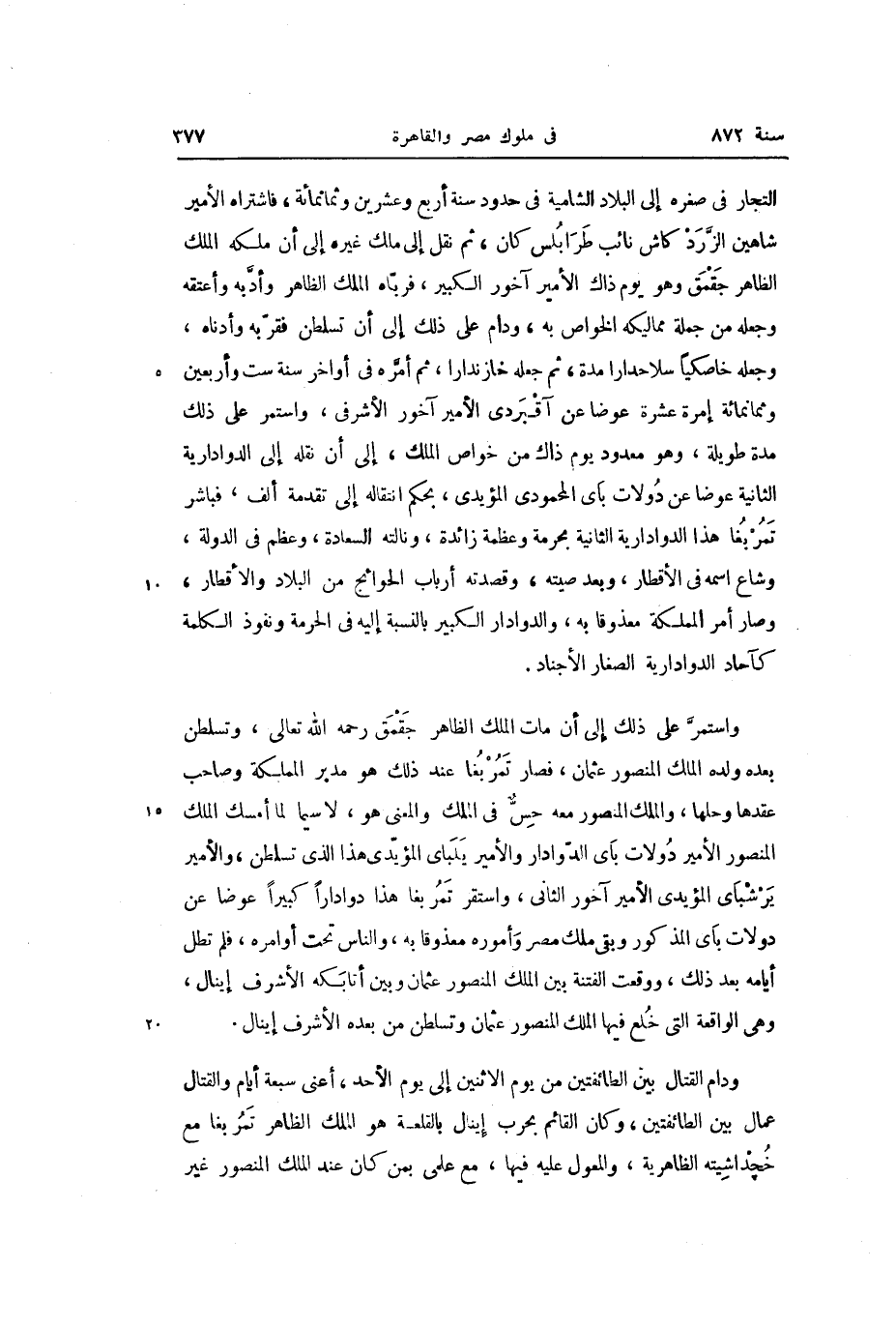 واستمرّ على ذلك إلى أن مات الملك الظاهر جقمق رحمه الله تعالى، وتسلطن بعده ولده الملك المنصور عثمان، فصار تمربغا عند ذلك هو مدبر المملكة وصاحب عقدها وحلها، والملك المنصور معه حسّ في الملك والمعنى هو، لا سيما لما أمسك الملك المنصور الأمير دولات باى الدّوادار والأمير يلباى المؤيّدى هذا الذي تسلطن، والأمير يرشباى المؤيدى الأمير آخور الثانى، واستقر تمربغا هذا دوادارا كبيرا عوضا عن دولات باى المذكور وبقى ملك مصر وأموره معذوقا به، والناس تحت أوامره، فلم تطل أيامه بعد ذلك، ووقعت الفتنة بين الملك المنصور عثمان وبين أتابكه الأشرف إينال، وهى الواقعة التي خلع فيها الملك المنصور عثمان وتسلطن من بعده الأشرف إينال.