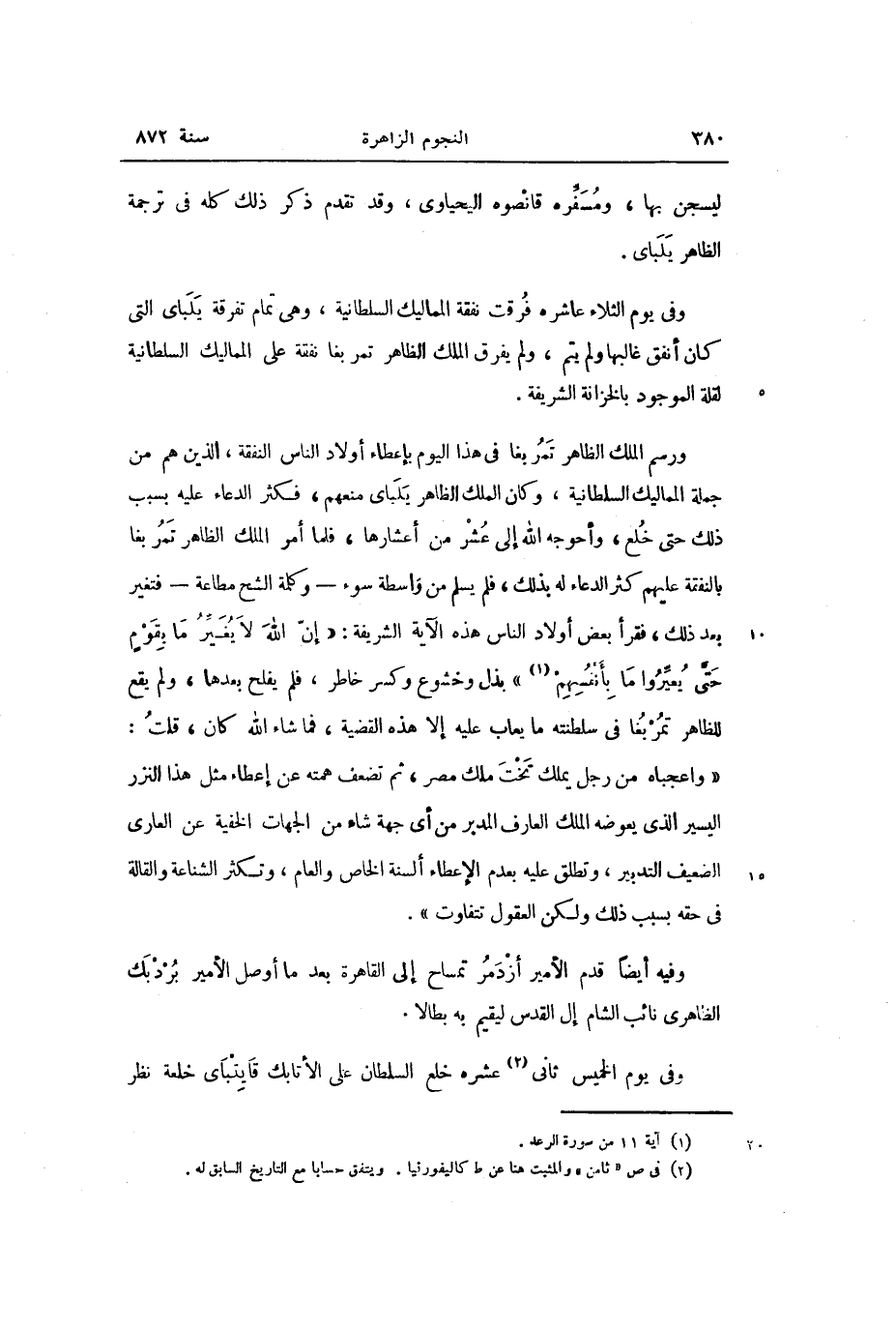 ورسم الملك الظاهر تمربغا في هذا اليوم بإعطاء أولاد الناس النفقة، الذين هم من جملة المماليك السلطانية، وكان الملك الظاهر يلباى منعهم، فكثر الدعاء عليه بسبب ذلك حتى خلع، وأحوجه الله إلى عشر من أعشارها، فلما أمر الملك الظاهر تمربغا بالنفقة عليهم كثر الدعاء له بذلك، فلم يسلم من واسطة سوء- وكلمة الشح مطاعة- فتغير بعد ذلك، فقرأ بعض أولاد الناس هذه الآية الشريفة: «إنّ الله لا يغيّر ما بقوم حتّى يغيّروا ما بأنفسهم «1» » بذل وخشوع وكسر خاطر، فلم يفلح بعدها، ولم يقع للظاهر تمربغا في سلطنته ما يعاب عليه إلا هذه القضية، فما شاء الله كان، قلت: