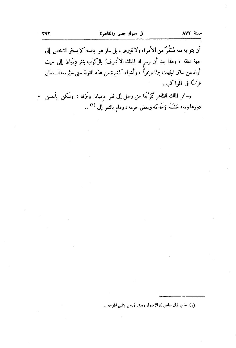 أن يتوجه معه مسفّر من الأمراء ولا غيرهم، بل سار هو بنفسه كما يسافر الشخص إلى جهة تعلقه، وهذا بعد أن رسم له الملك الأشرف بالركوب بثغر دمياط إلى حيث أراد من سائر الجهات برّا وبحرا، وأشياء كثيرة من هذه المقولة حتى سيّر معه السلطان فرسا في المواكب.
